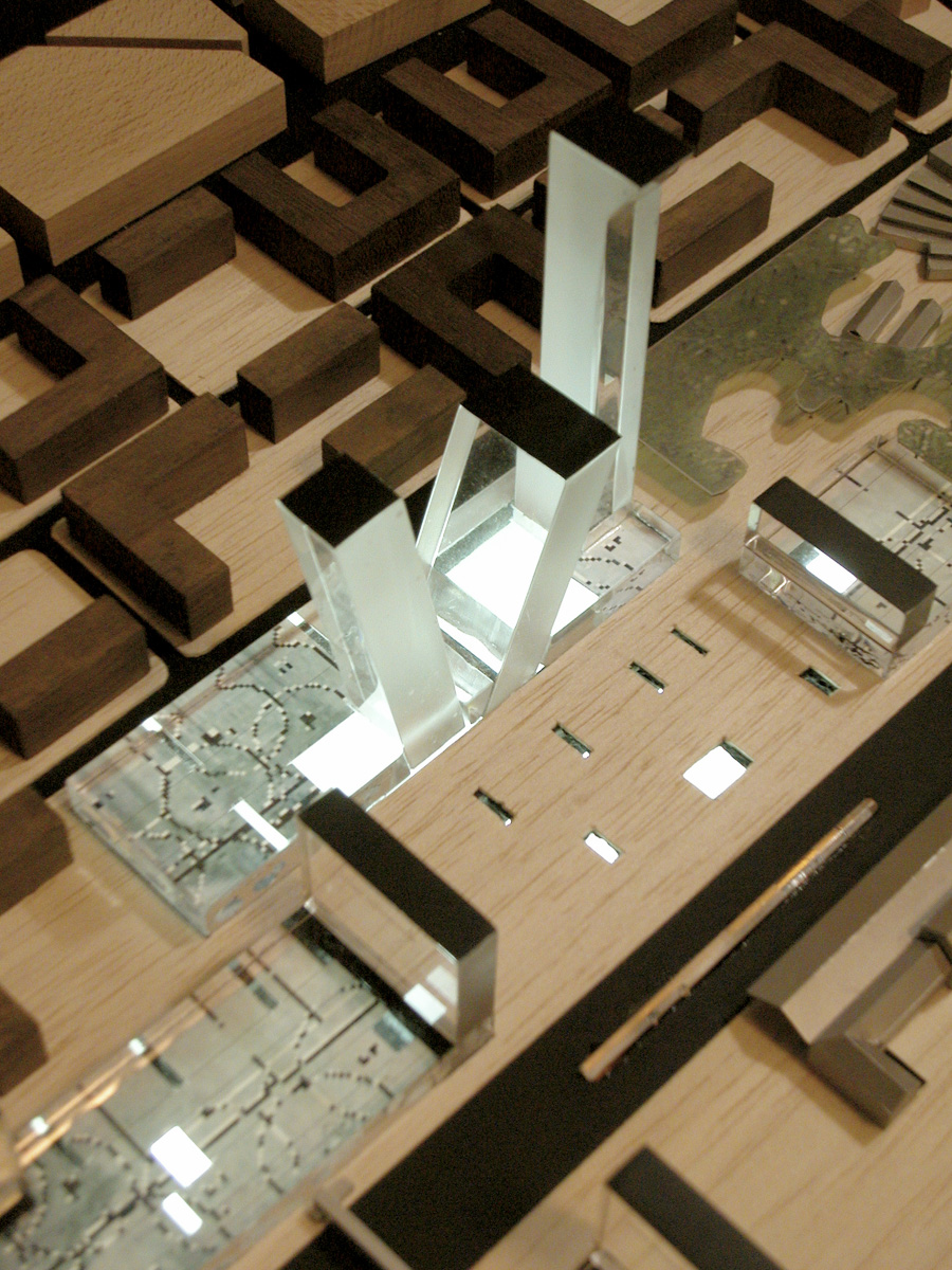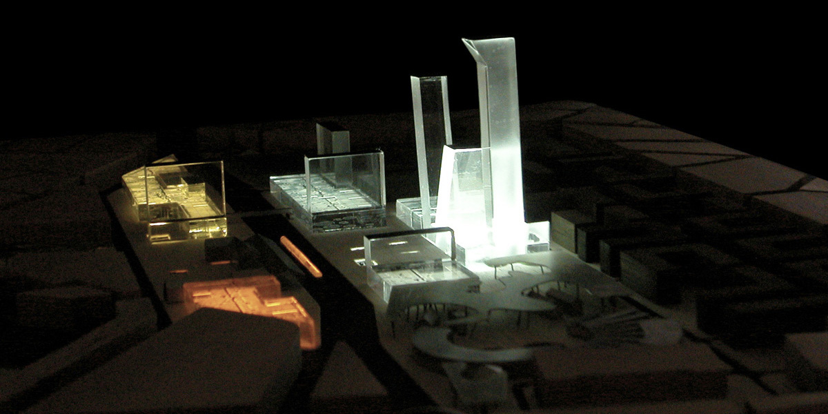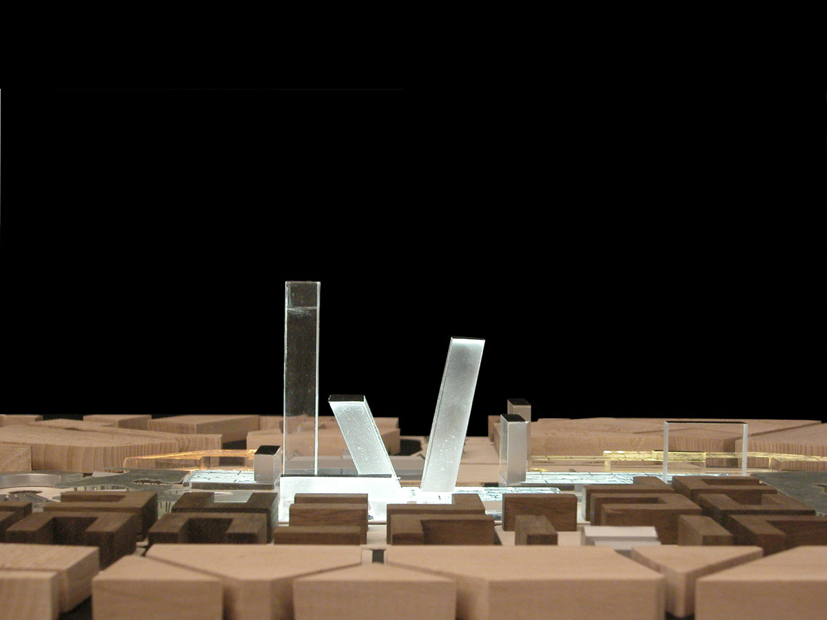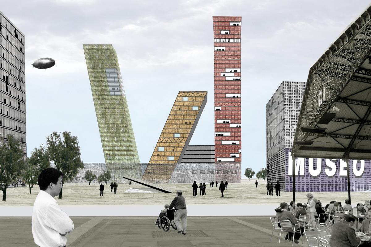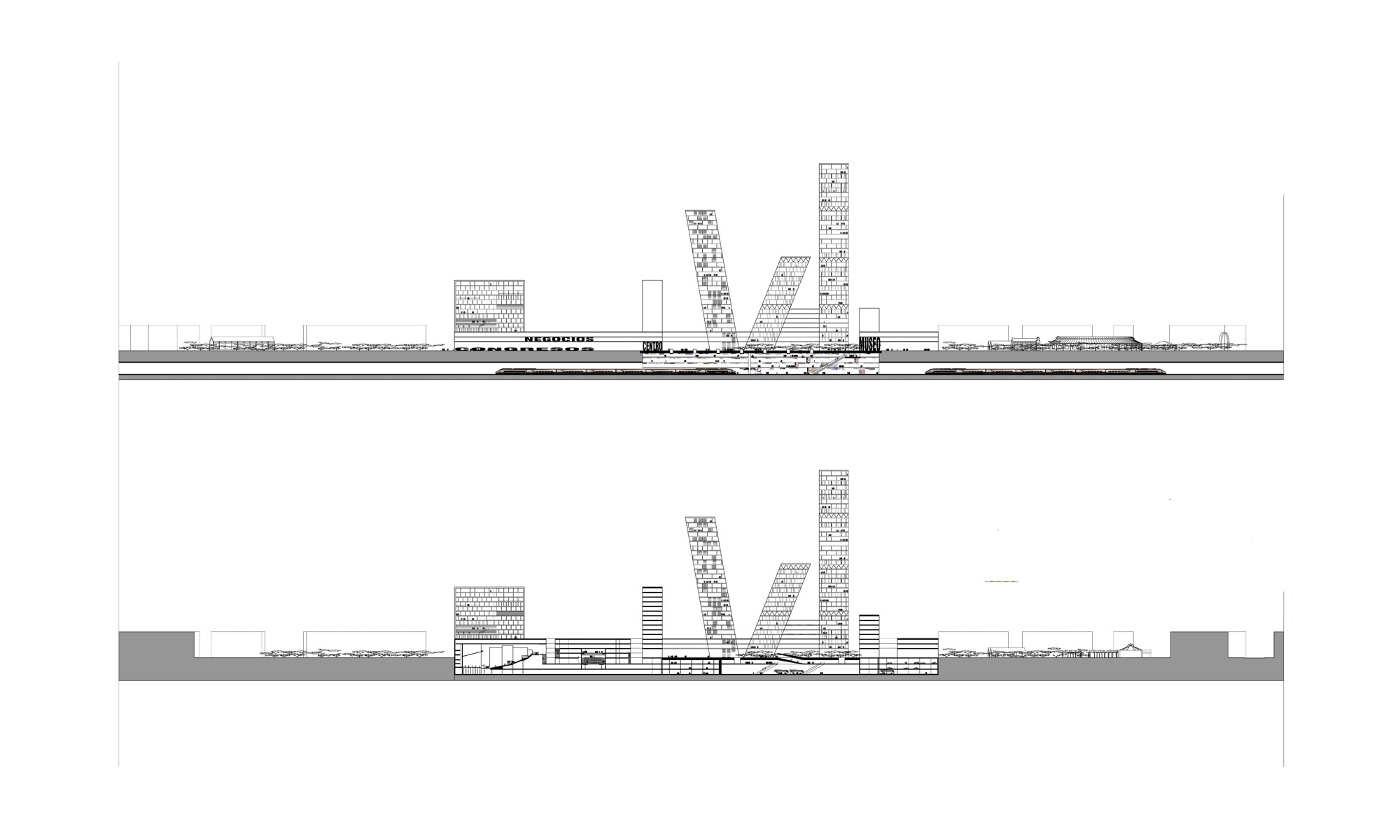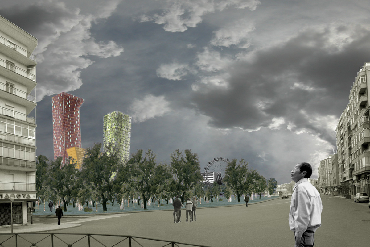 Sobre la plaza un icono urbano de gran escala. Valladolid necesita un icono de modernidad que sintetice una manera de entender la ciudad contemporánea, visible desde gran parte de la ciudad, capaz de cambiar el centro de gravedad urbano y capturar barrios hoy alejados y con peligro de segregación, a modo de foco de referencia. Proponemos la construcción de un conjunto de rascacielos de uso y carácter híbrido de hasta 40 plantas y con 160 m. de altura total, esculpiendo en el aire un abstracto icono de la ciudad que tiene su origen en la caligrafía VA
