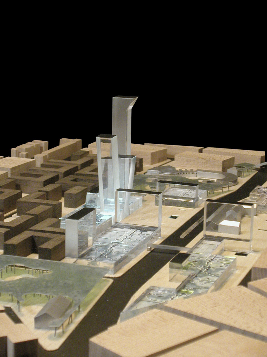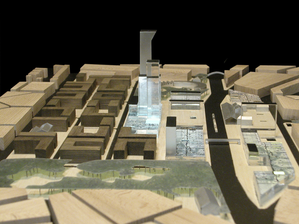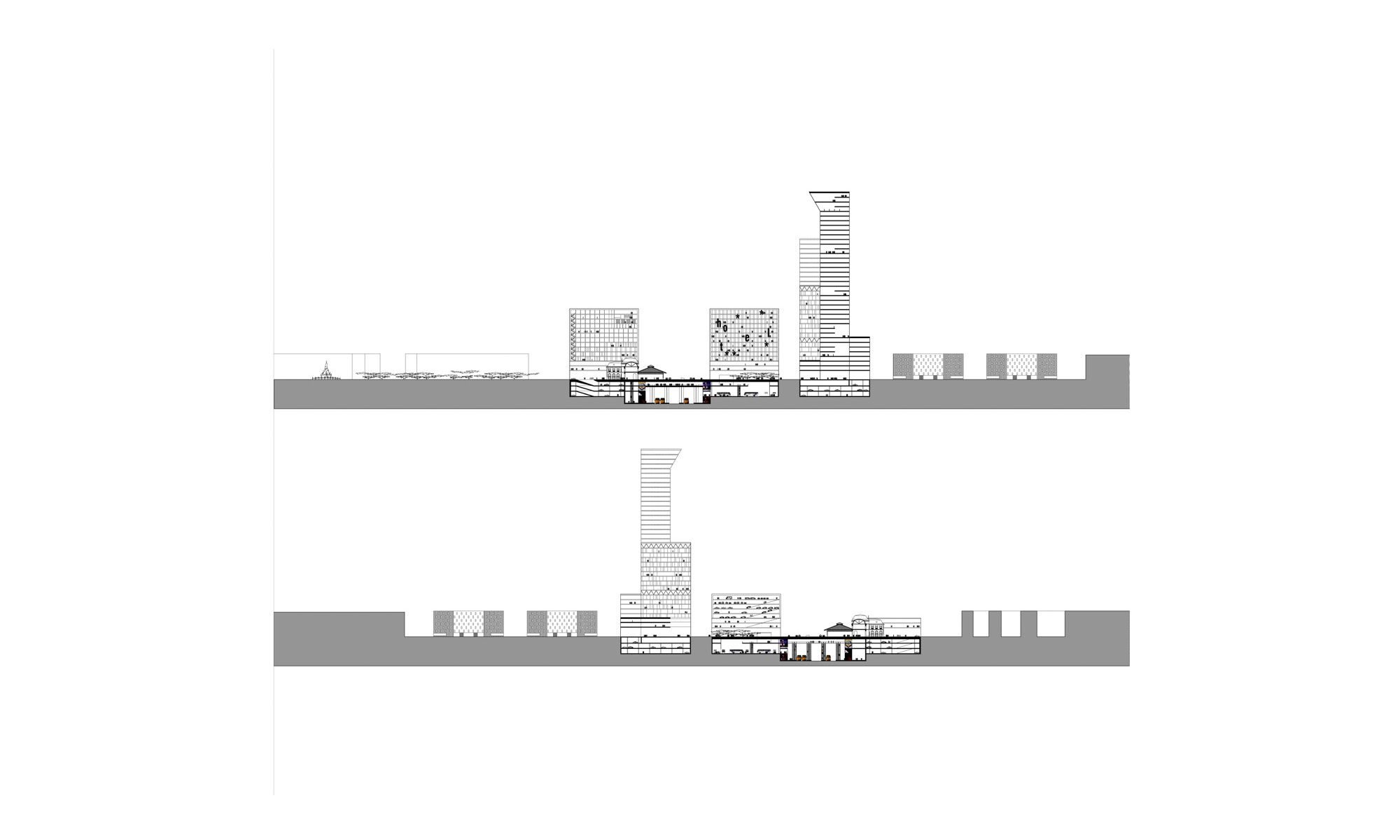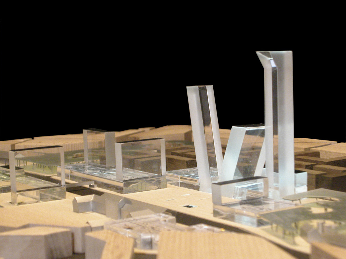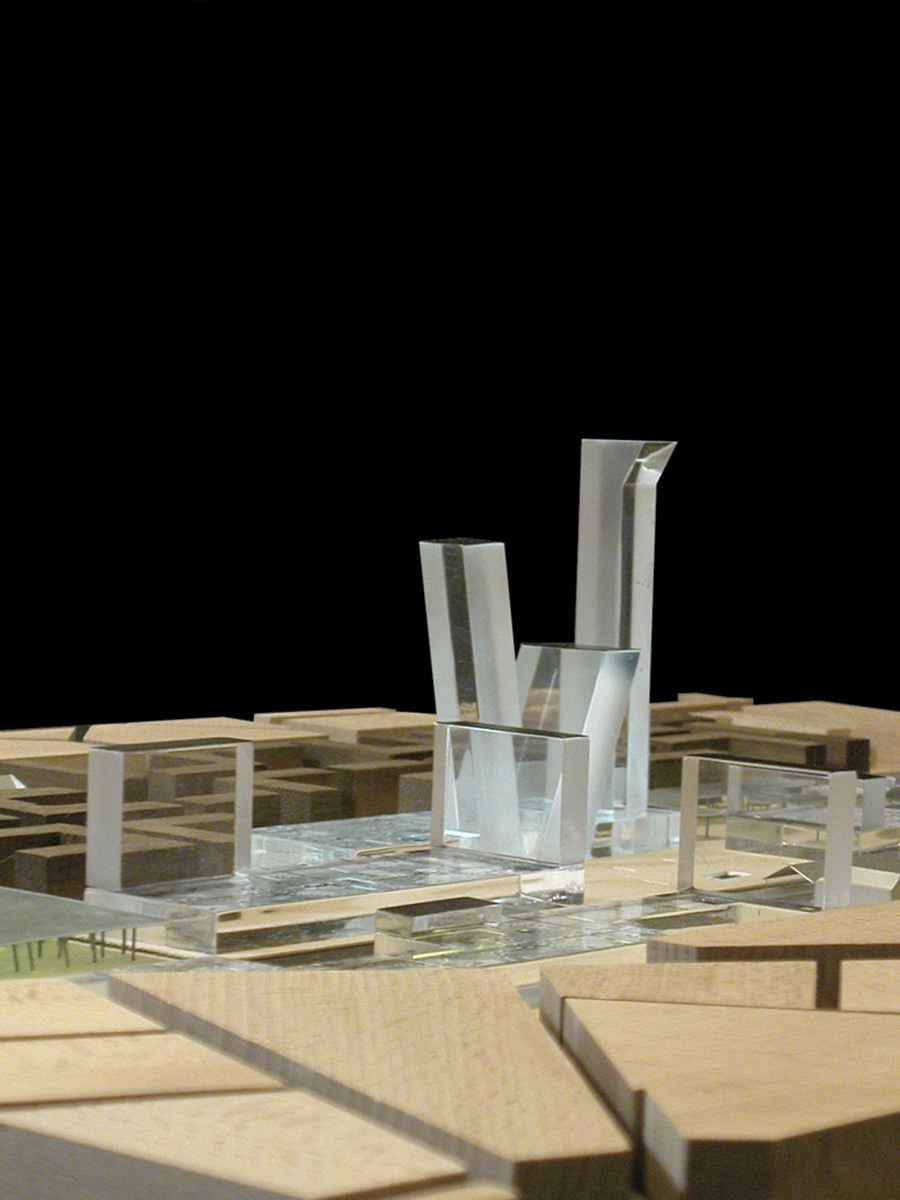 Sobre la plaza un icono urbano de gran escala. Valladolid necesita un icono de modernidad que sintetice una manera de entender la ciudad contemporánea, visible desde gran parte de la ciudad, capaz de cambiar el centro de gravedad urbano y capturar barrios hoy alejados y con peligro de segregación, a modo de foco de referencia. Proponemos la construcción de un conjunto de rascacielos de uso y carácter híbrido de hasta 40 plantas y con 160 m. de altura total, esculpiendo en el aire un abstracto icono de la ciudad que tiene su origen en la caligrafía VA