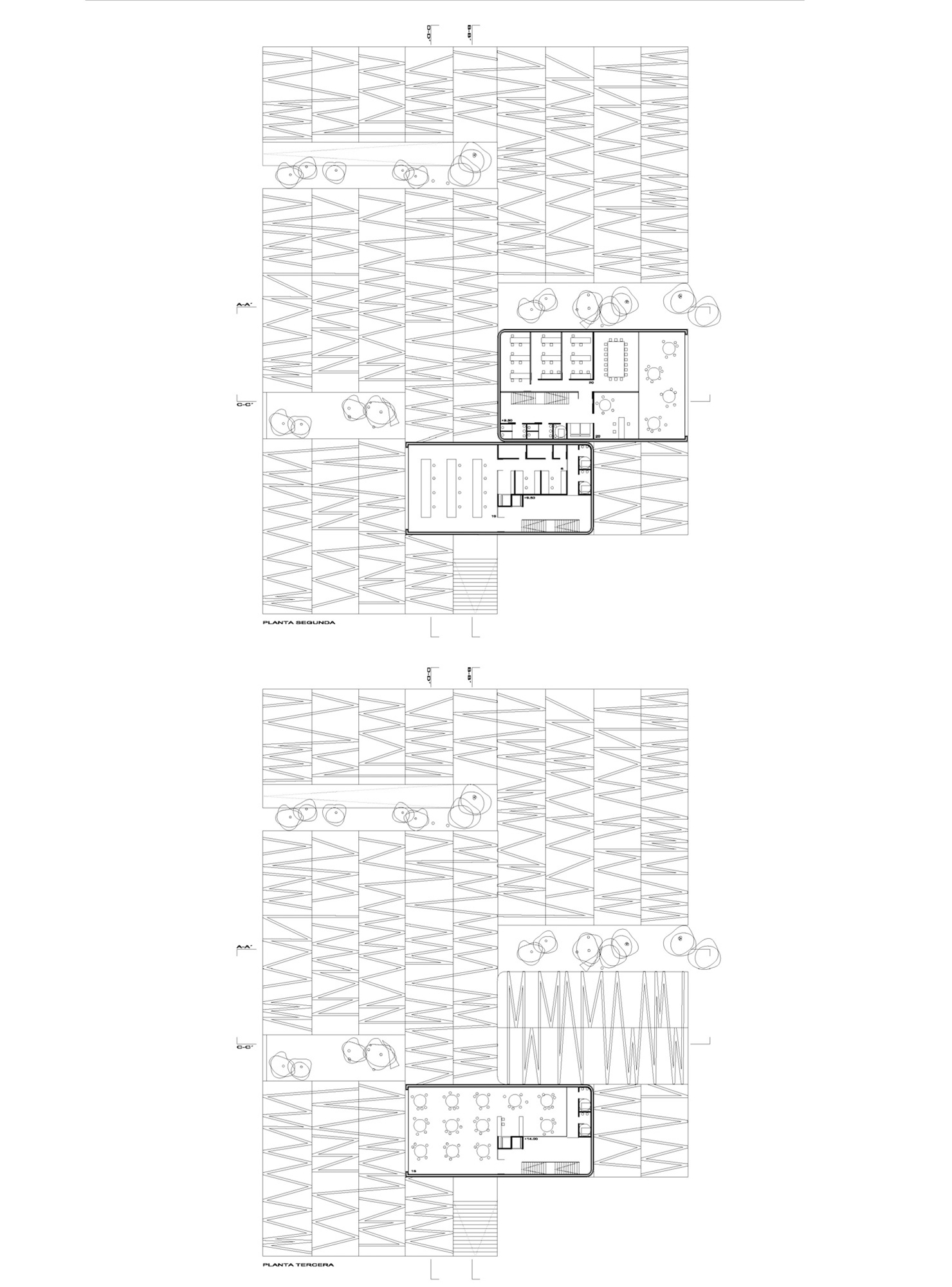 La morfología escogida plantea unas cubiertas planas ecológicas de última generación acabadas en parte mediante una plantación vegetal que retiene el polvo y la contaminación, es absorbente acústico con efectos refrigerantes y se riega con el agua recogida. El volumen emergente es una caja de doble vidrio de seguridad serigrafiado, de baja emisividad, con cámara de aire que alberga aire recirculado en ciclos de invierno y verano,”sunspace” complementado con una protección de celosía de viruta de madera reciclada y acero corten.