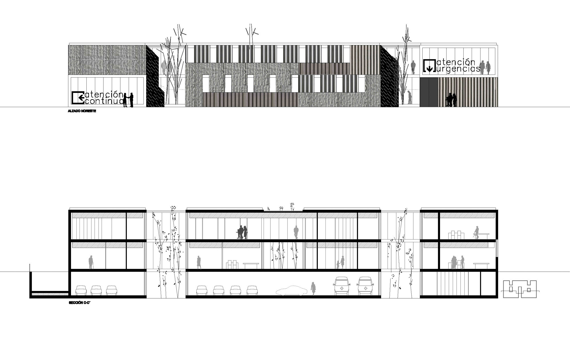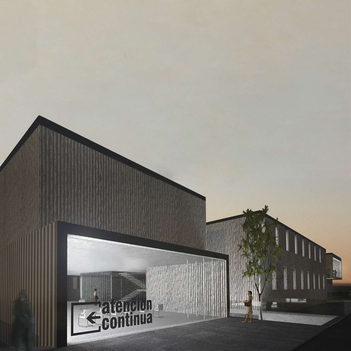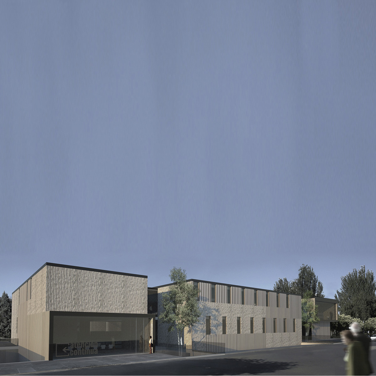 Se ha proyectado un edificio continuo, plegado sobre sí mismo, de dos alturas, consiguiendo con ello una gran extensión de fachadas con la totalidad de los espacios iluminados y ventilados naturalmente al exterior o a patios abiertos a fachadas. Los accesos públicos están claramente marcados en las fachadas y los límites bien protegidos.