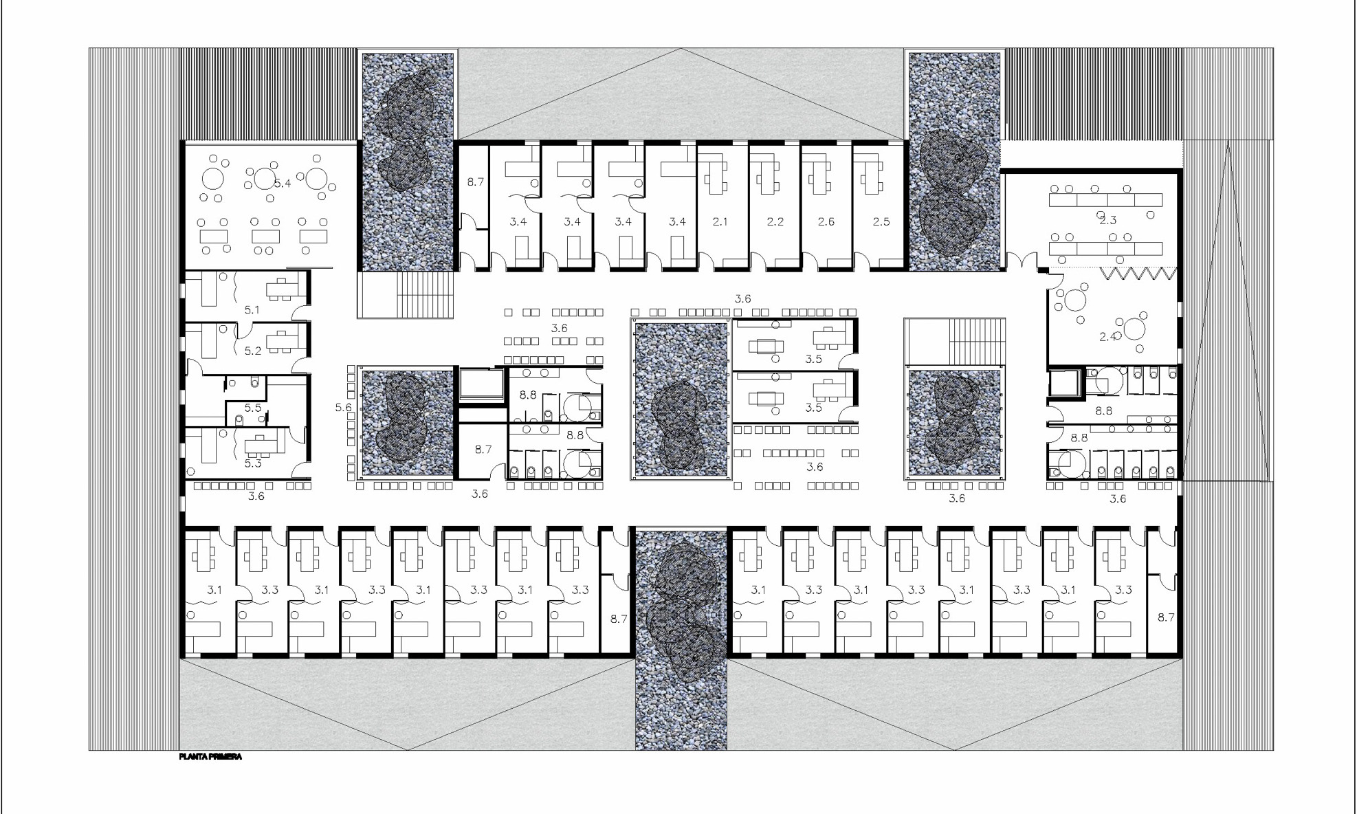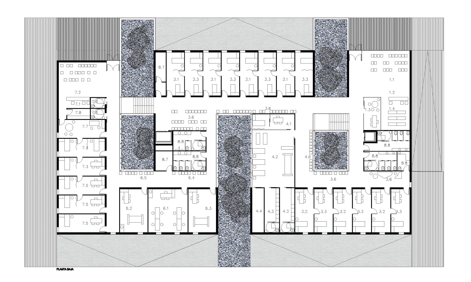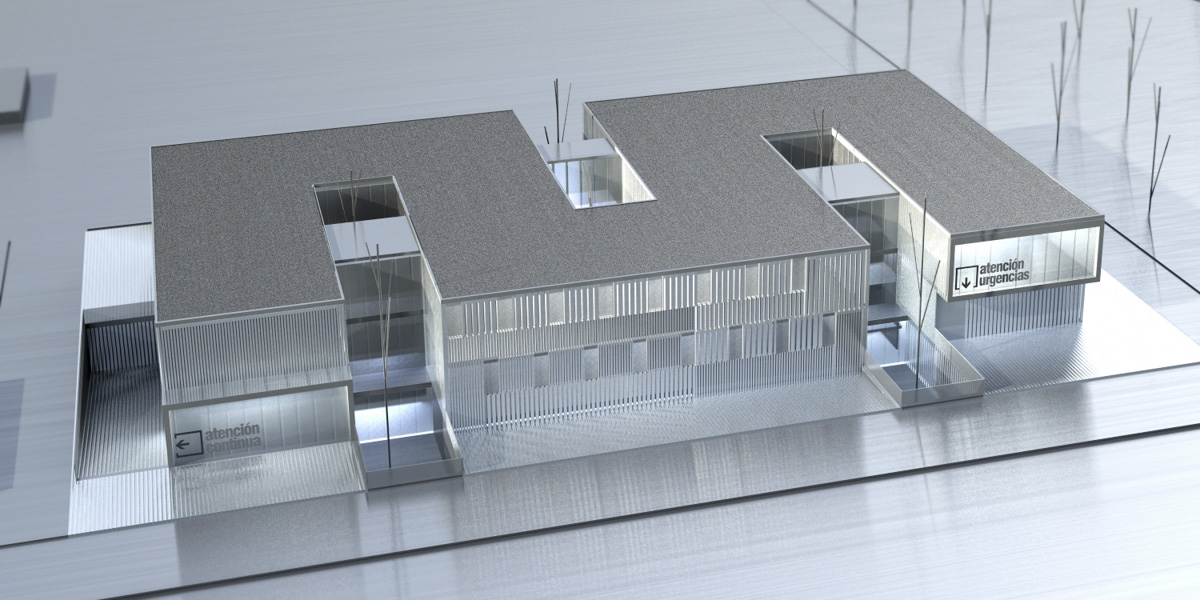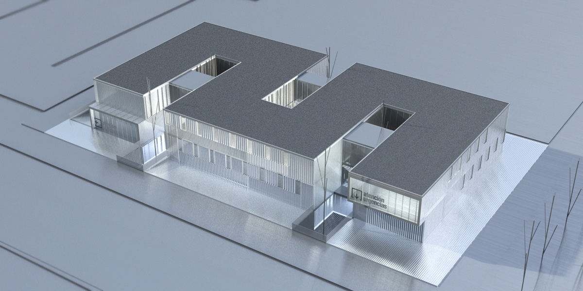 La distribución continua de los espacios en torno a sus pliegues se realiza en forma serpenteante. Este se apoya en un lateral que contiene la entrada al Centro de Salud, las escaleras, los ascensores, servicios públicos y una banda ancha de distribución, de la cual parten los pasillos hacia las consultas y otras dependencias ligadas a los patios. Se logra con ello claridad de circulaciones para una buena orientación del usuario y recorridos alternativos entre espacios funcionales para una mayor versatilidad de usos y su posible modificación futura sin afectar a las partes comunes del edificio.