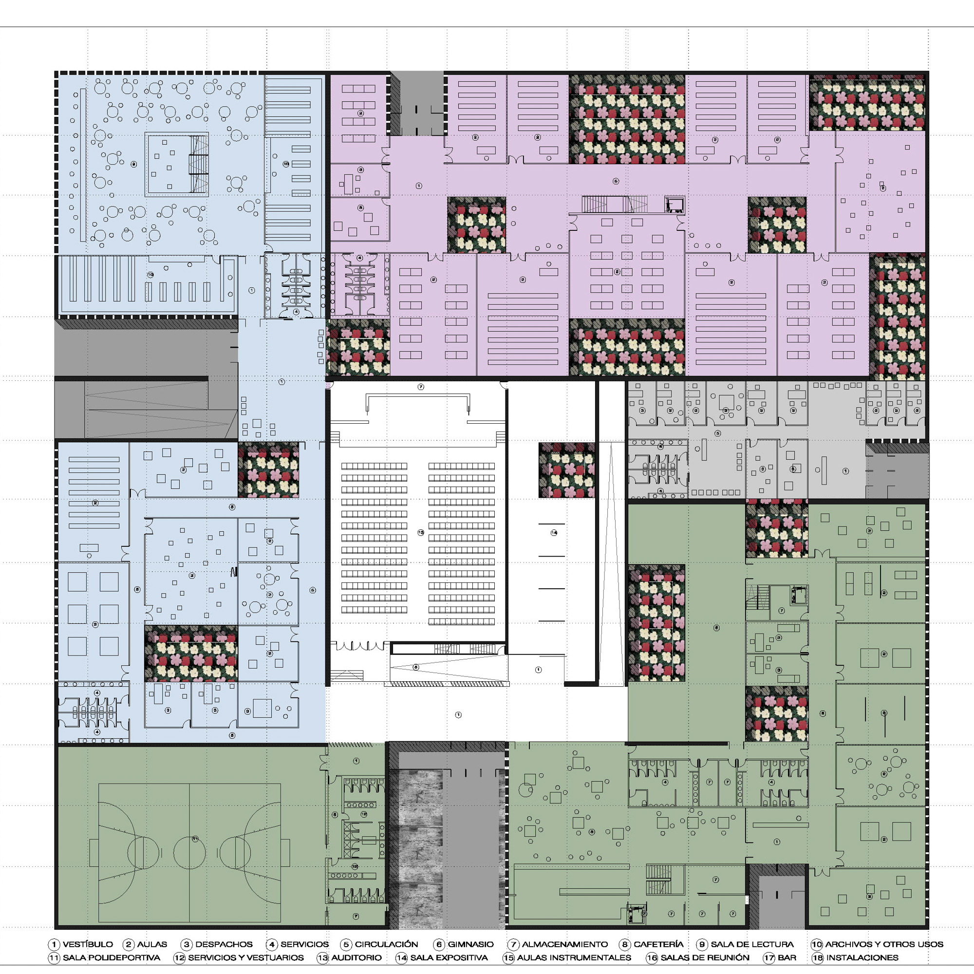 Desde el compromiso de realizar un edificio ecoeficiente de altas prestaciones bioclimáticas, tanto desde un punto de vista pasivo como activo, pero sin renunciar a una arquitectura contemporánea, el planteamiento general del conjunto prevé la reforma del edificio existente para la realización de un conjunto articulado espacialmente entorno a los patios existentes, con una vegetación exuberante y una cubierta jardín que aloja los usos de planta primera a la que se accede a través de dos rampas.