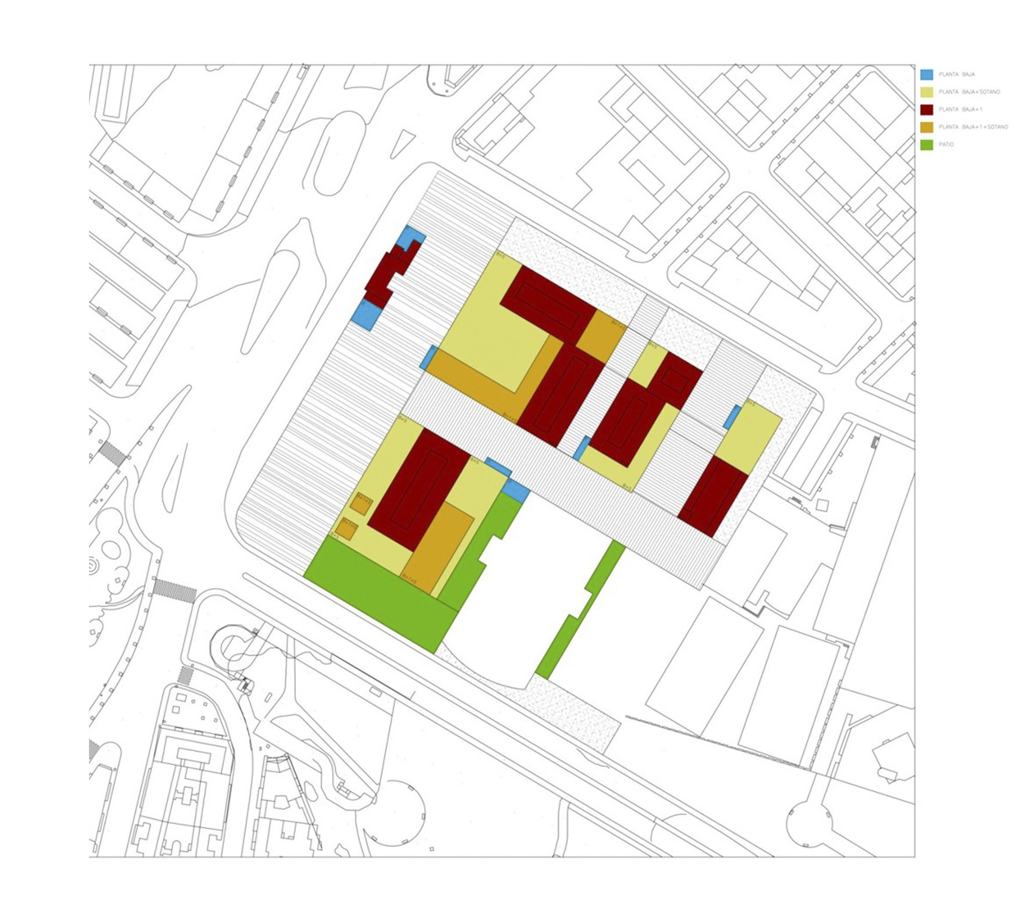 Proponer para ello una trama urbana, delimitando los edificios mediante calles y plazas. Las nuevas construcciones estarían formadas por los pabellones preexistentes y los nuevos añadidos.