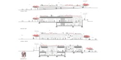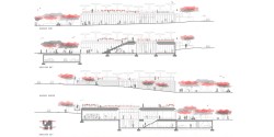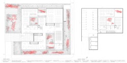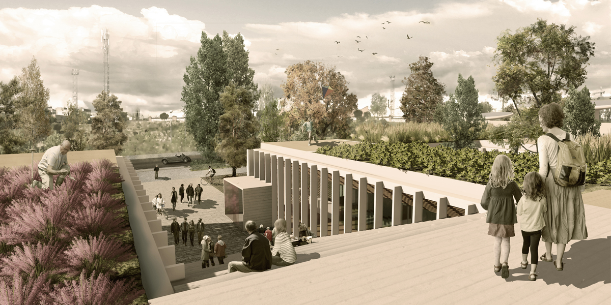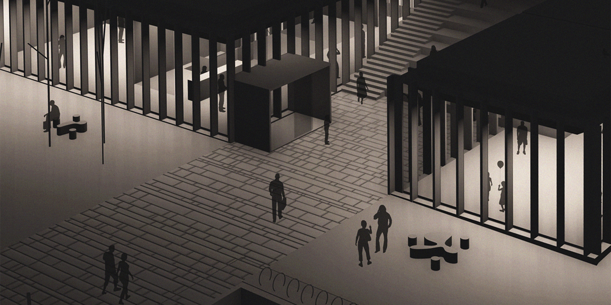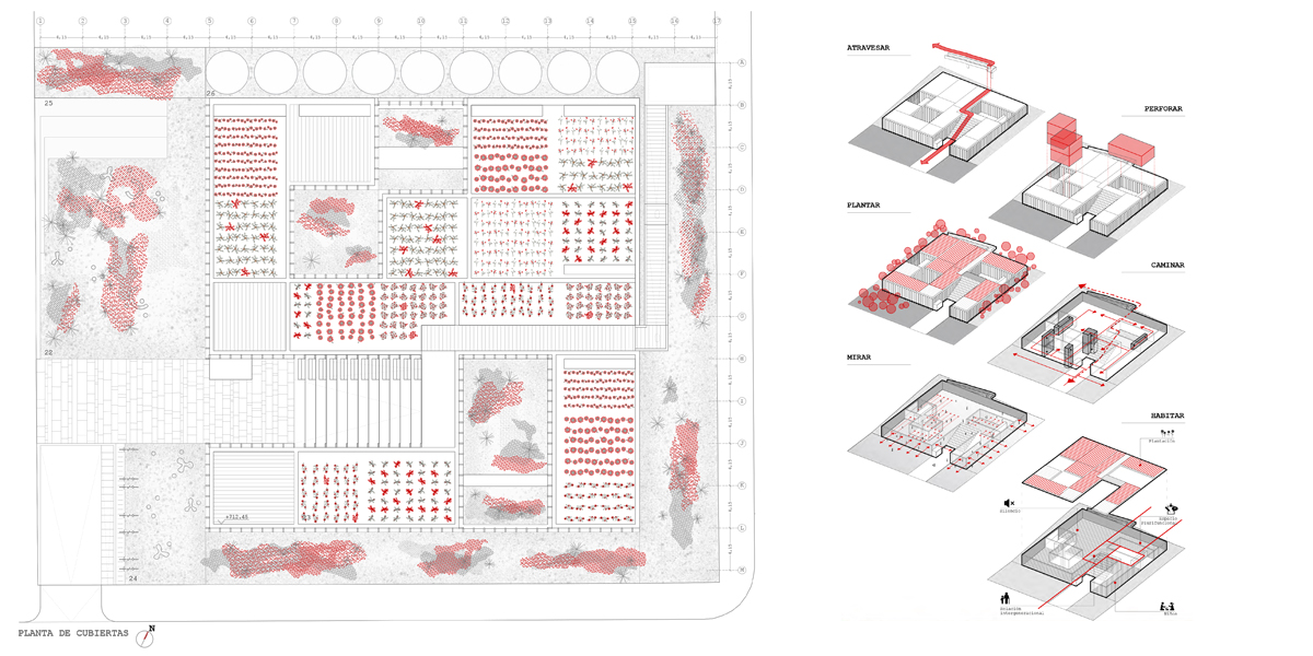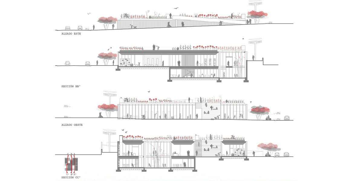 La lonja o plaza de barrio, orientada a la calle Castillo de Candanchú, constituido como un lugar de encuentro, y la cubierta-jardín, acceso desde la calle Burguete, el punto más alto del solar, convertida en un lugar de encuentro intergeneracional, asociado a los huertos urbanos propuestos. Todo ello se materializa finalmente en una cubierta verde accesible y un nuevo anfiteatro al aire libre.