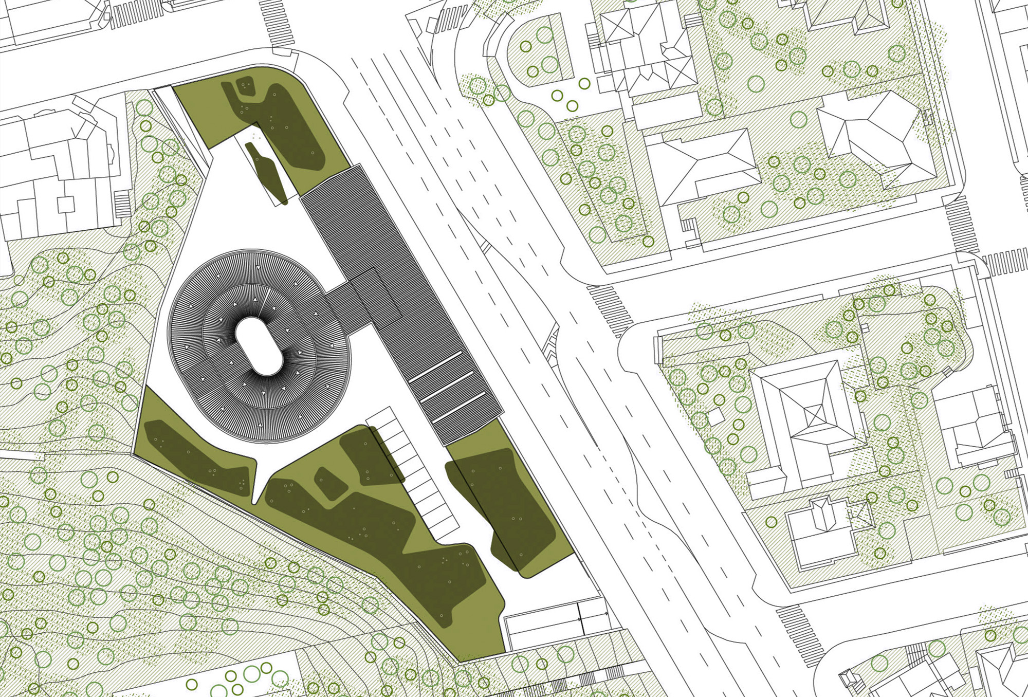 La segunda estrategia pasa por reintegrar todo el espacio libre de la parcela a una narración que completa el sentido natural del entorno, de características en cierto modo agrestes, asociadas de la colina del observatorio adyacente. Con ello se pretende una fusión completa ente espacio libre y entorno. De este modo, el conjunto edificado final adquiere un papel protagonista del que hoy en día carece.