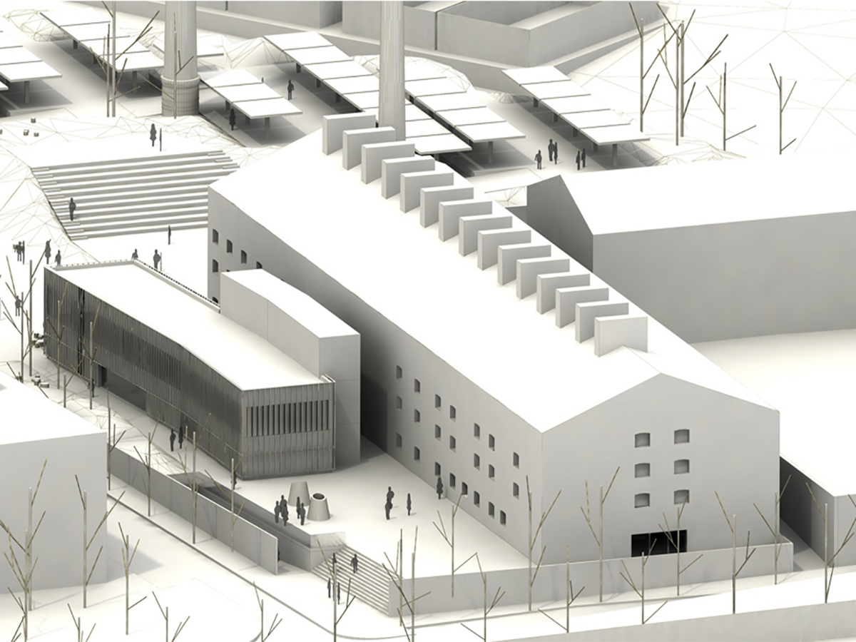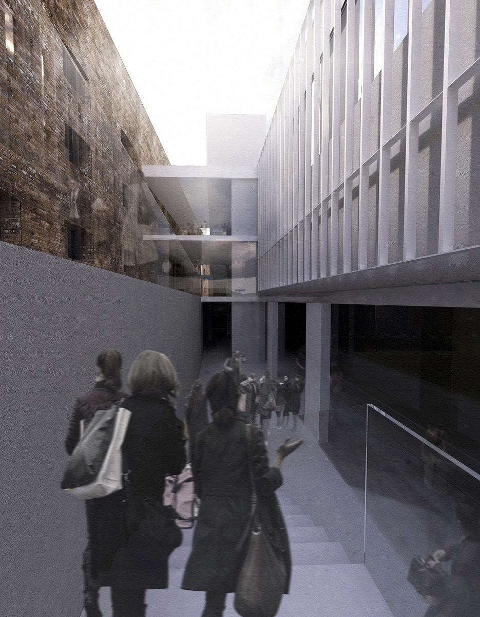 Es concebido claramente como un anexo a la construcción original, debe, por tanto, de reforzar su condición de nuevo y DIALOGAR con gran edificio industrial precedente. Por ello se diseña una CONEXIÓN entre ambos de marcado carácter TRANSPARENTE, en forma de grieta, a modo de JUNTA VACÍA que separa los dos volúmenes construidos.