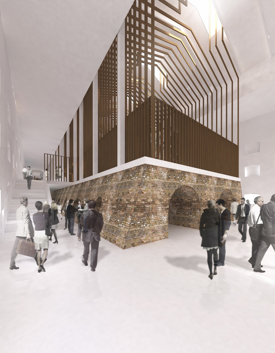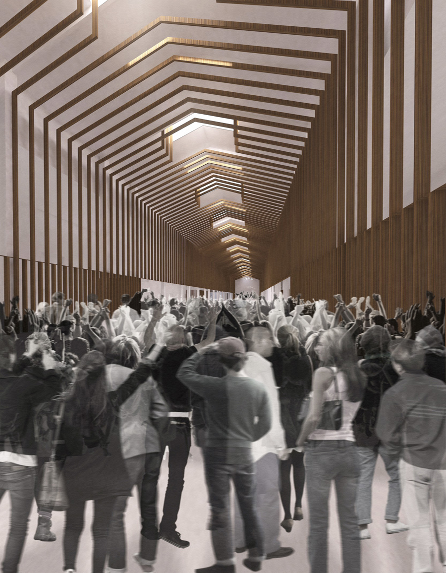 El espacio de mayor dimensión se diseña para que sea altamente eficaz, de manera POLIVALENTE Y FLEXIBLE, capaz de dar respuesta funcional a actividades muy variadas, como ferias, congresos, conciertos etc… Ahora bien ello no está reñido con la firme voluntad de generar un ESPACIO EMBLEMÁTICO y fuertemente caracterizado, para lo cual se recupera la LUZ CENITAL original y se refuerza la condición “BASILICAL” de su interior, tan próximo a espacios “Litúrgicos” y a su vez tan presente en muchas construcciones industriales del siglo XIX.