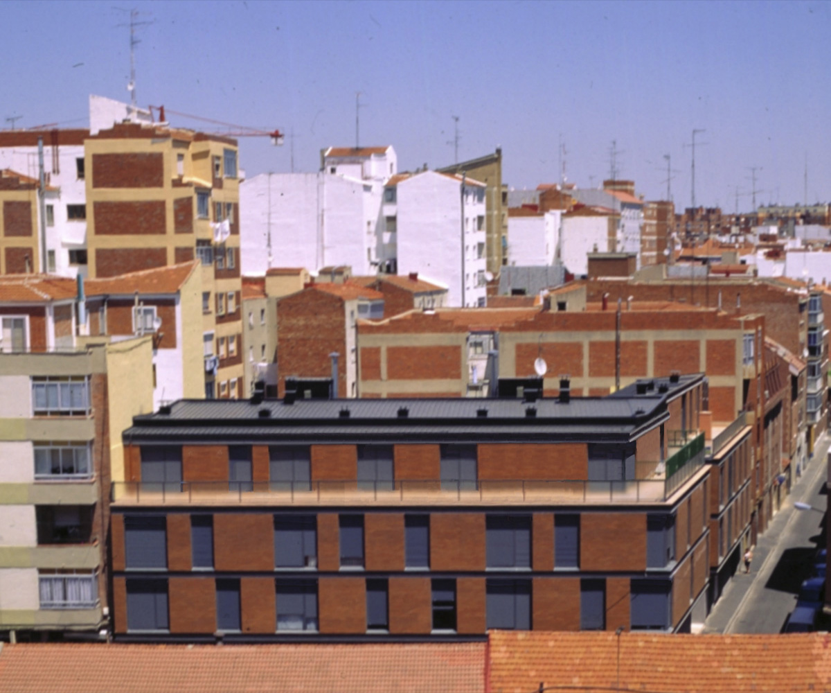 - La idea de intervención volumétrica, más que «formal», para lo que se propone una solución en dos bloques. Uno de ellos, con fachada a la calle Villanueva, se compone de baja, dos plantas y ático, y contiene un programa de viviendas más convencional, con dos bloques de comunicación vertical y dos viviendas por planta cada uno. El otro, con fachada a la calle de Julio Ruiz de Alda, contiene un programa de vivienda más singular, considerando además en este caso la estrechez de la crujía propuesta por la normativa urbanística.