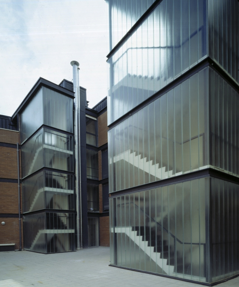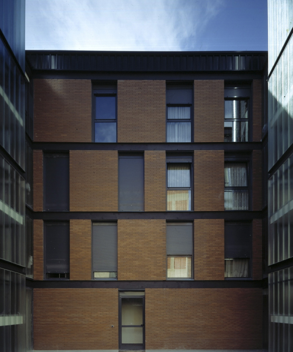 - El tratamiento de los núcleos de comunicación que aparecen exentos en el patio, como dos cajas acristaladas que actúan en forma de linternas para los largos pasillos de acceso a las viviendas del bloque de crujía grande.
