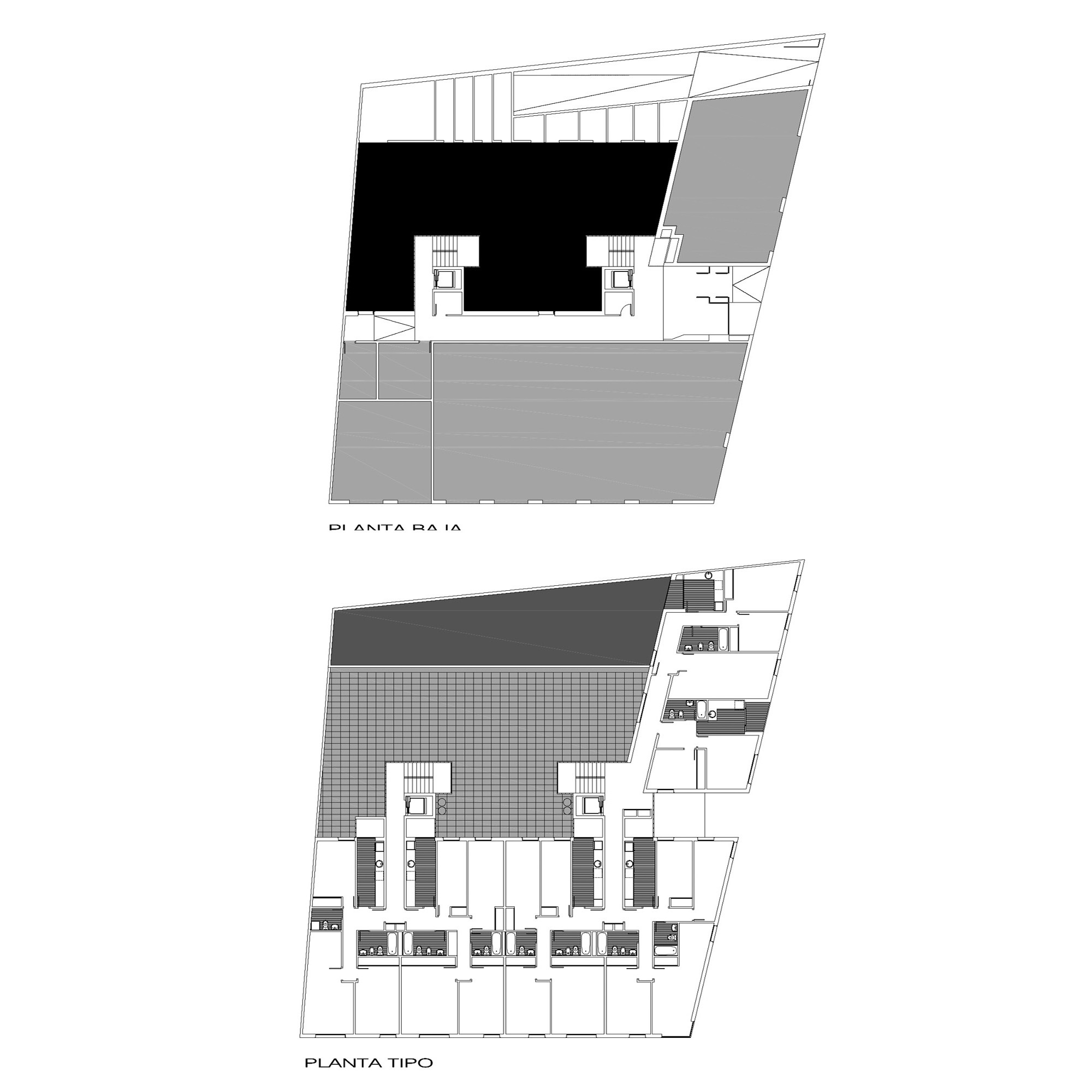 - La conexión entre los dos bloque se hace a través de la creación de un corredor de distribución, vinculado a uno de los núcleos de conexión vertical, y que genera la distribución a las unidades habitables del bloque de la calle Julio Ruiz de Alda. De este modo, se consigue además un único portal, que abriéndose a la calle Julio Ruiz de Alda, conecta entre sí los dos núcleos de comunicación vertical a través de un corredor en planta baja.