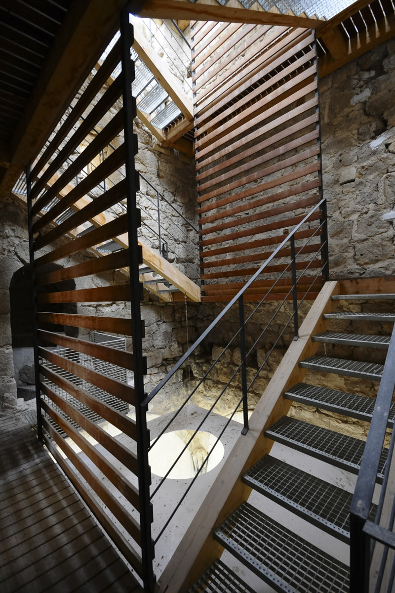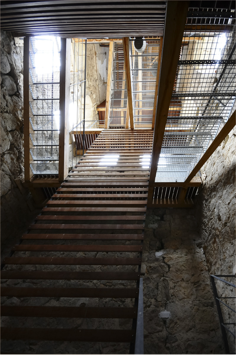 La segunda escalera, situada al sur, de factura posterior y disposición en caracol está formada por un vástago de madera del cual arrancan los peldaños de madera en él empotrados.
