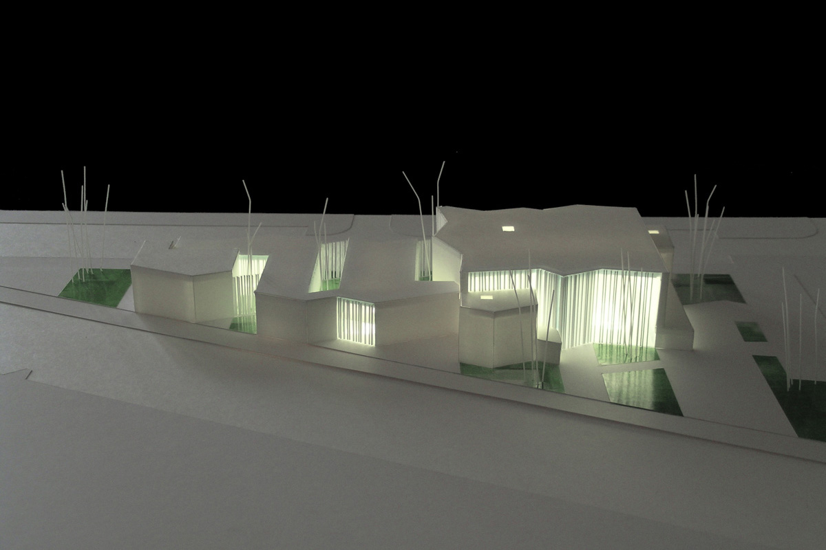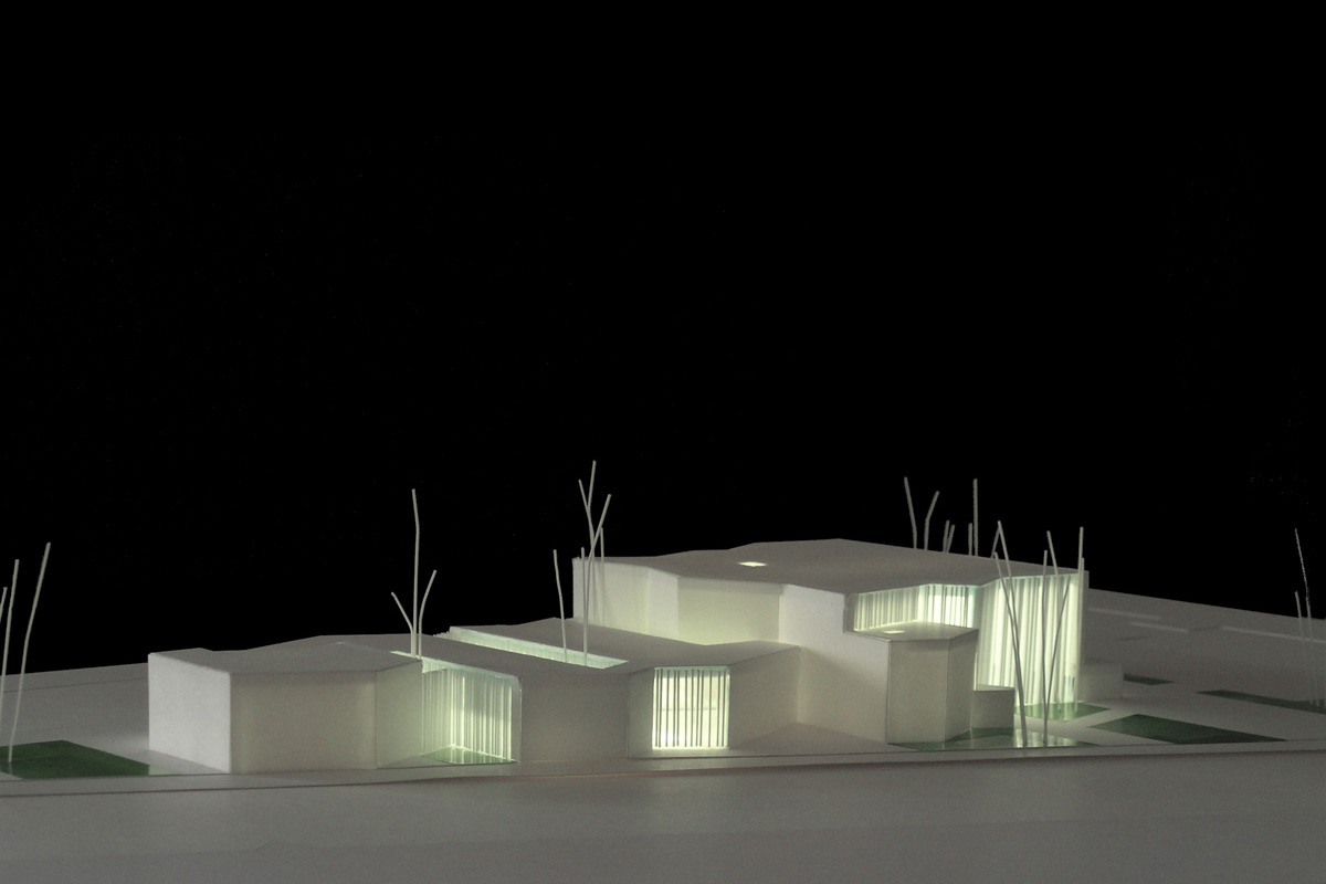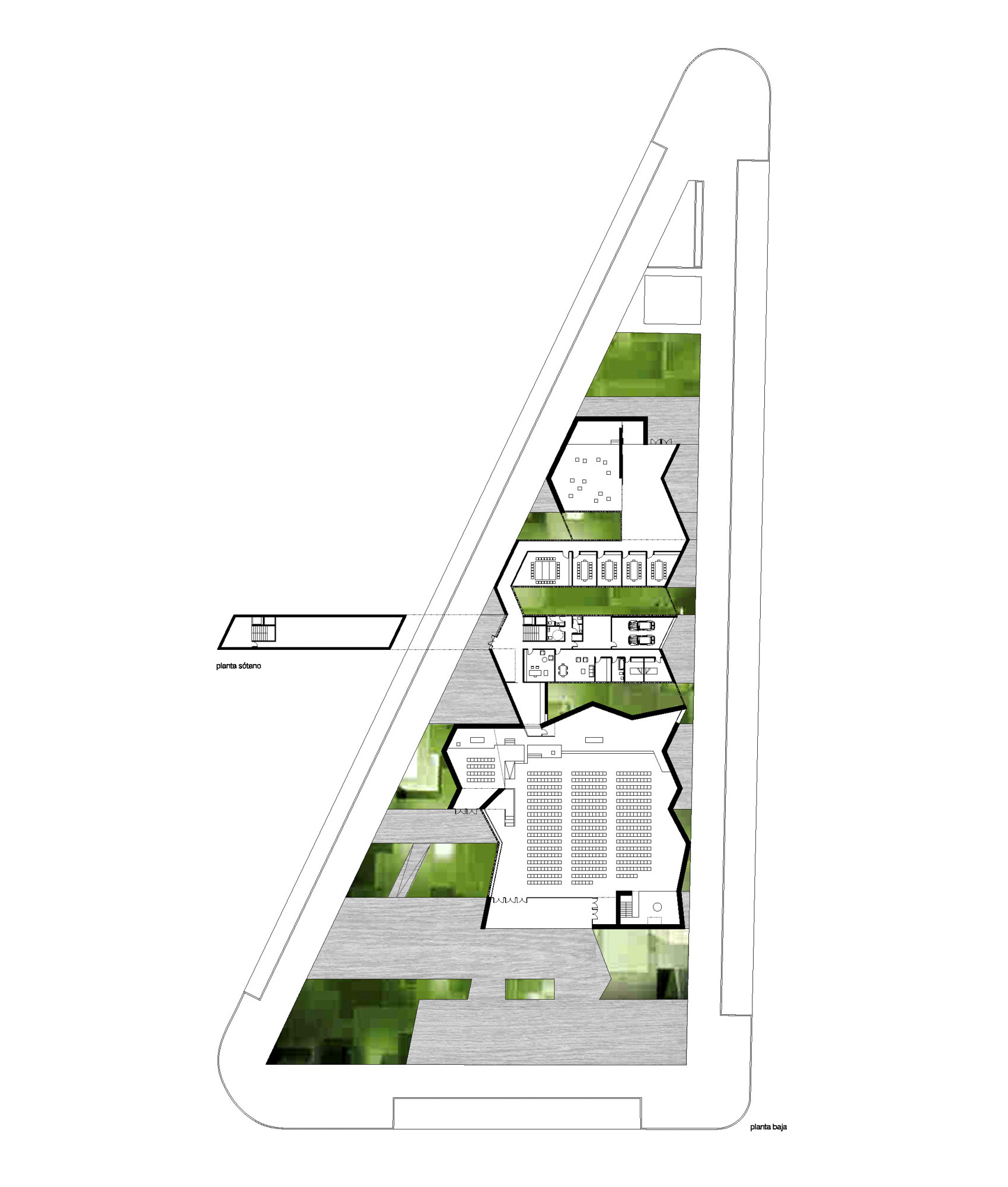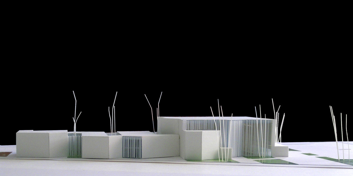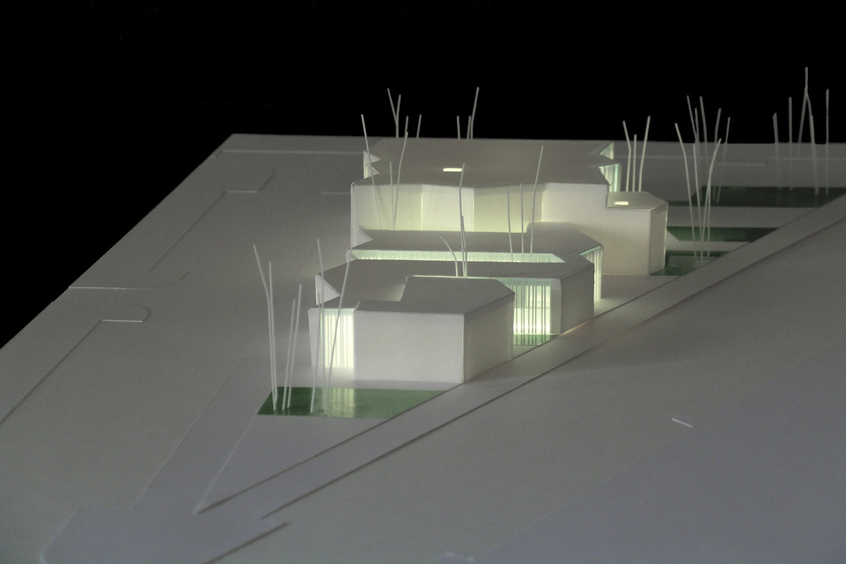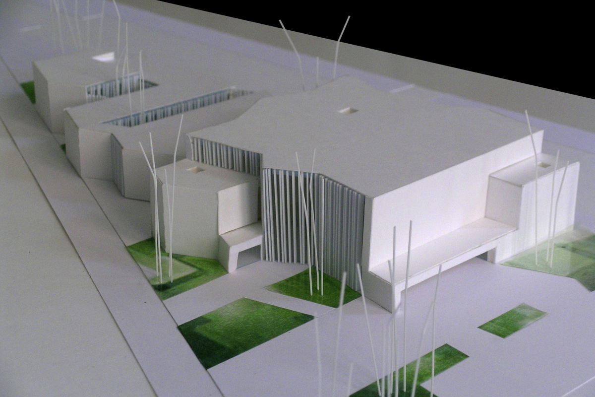 El proyecto propone la situación de las partes funcionales formando una unidad que se dispone en la parcela en la dirección Este-Oeste formando bandas. Las bandas se ordenan paralelas a la cara Este de la parcela, y presentan hacia las vías de circulación una sucesión de movimientos o pliegues.