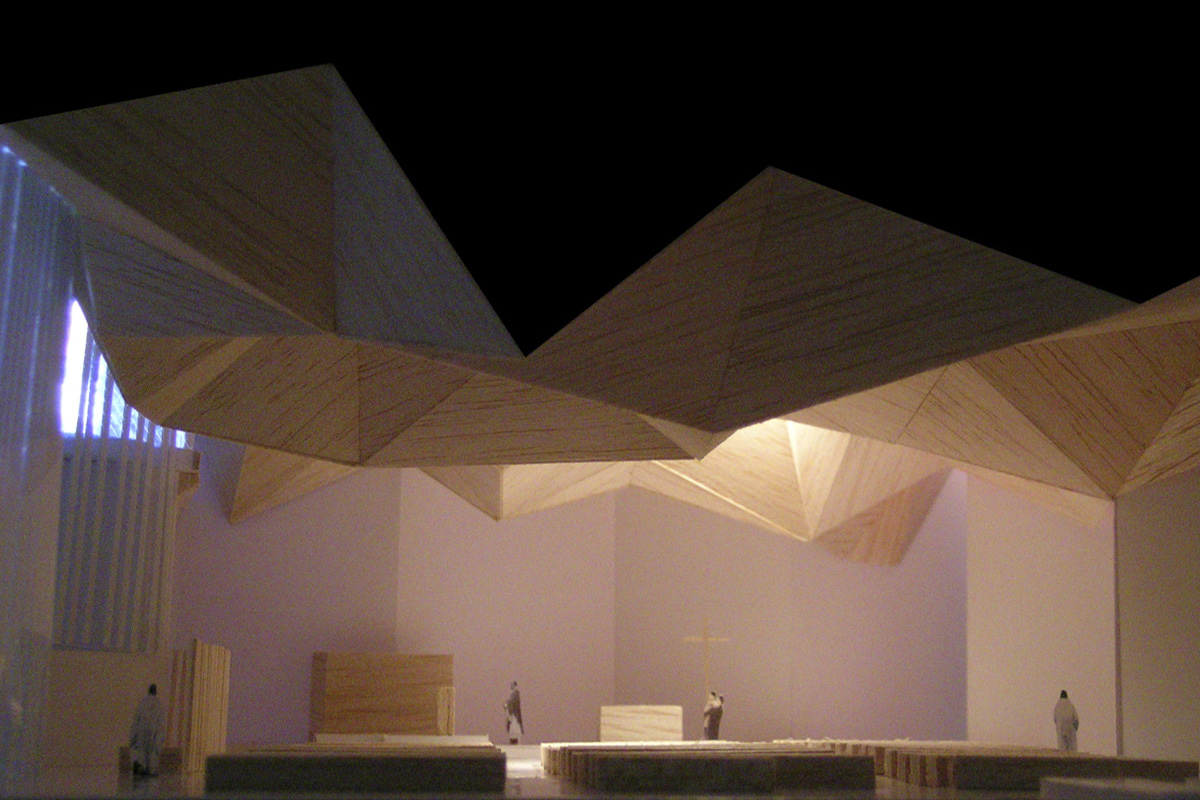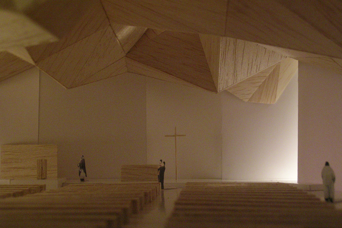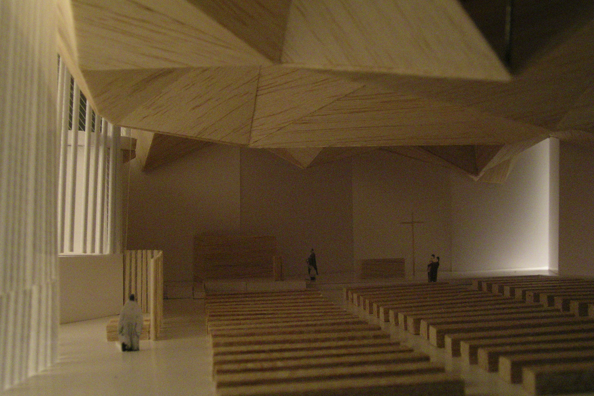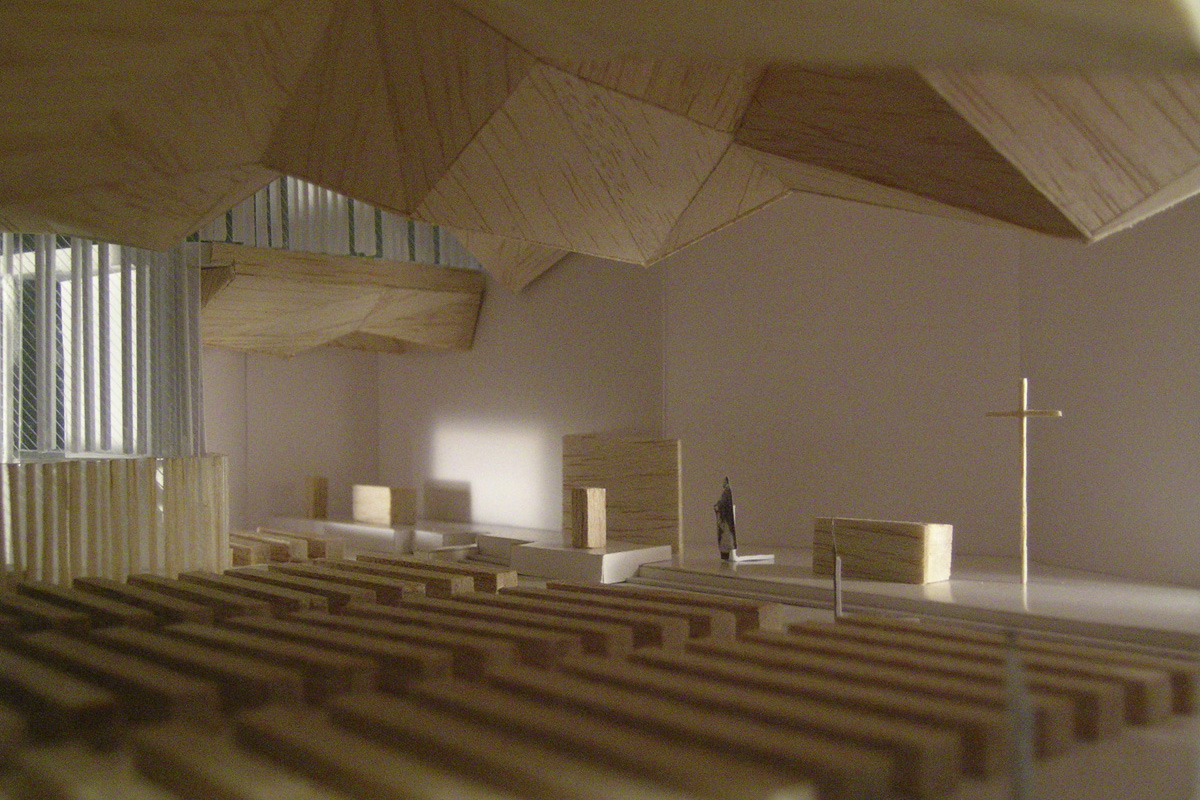 En efecto, las formas del espacio, sus trazados culminan en el final simbólico del altar. Esta es la razón de que los muros se vayan plegando sin hablar de nada más que de su propia materialidad. En la nave única se contraponen la luz y la sombra los muros cerrados y los acristalados, para conseguir un recinto esencial y evocador en el que se define con claridad el complejo significado de la función.