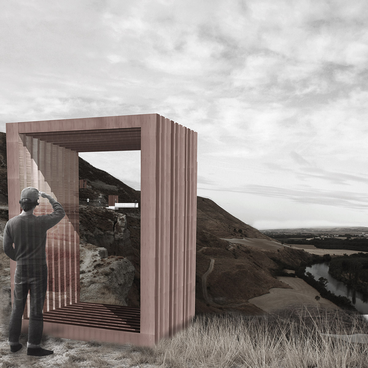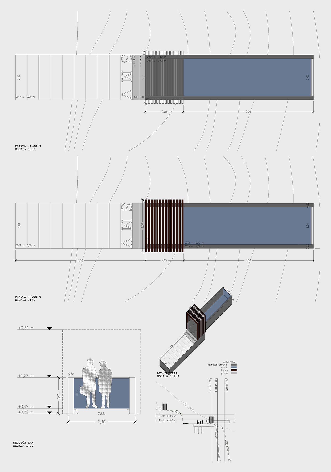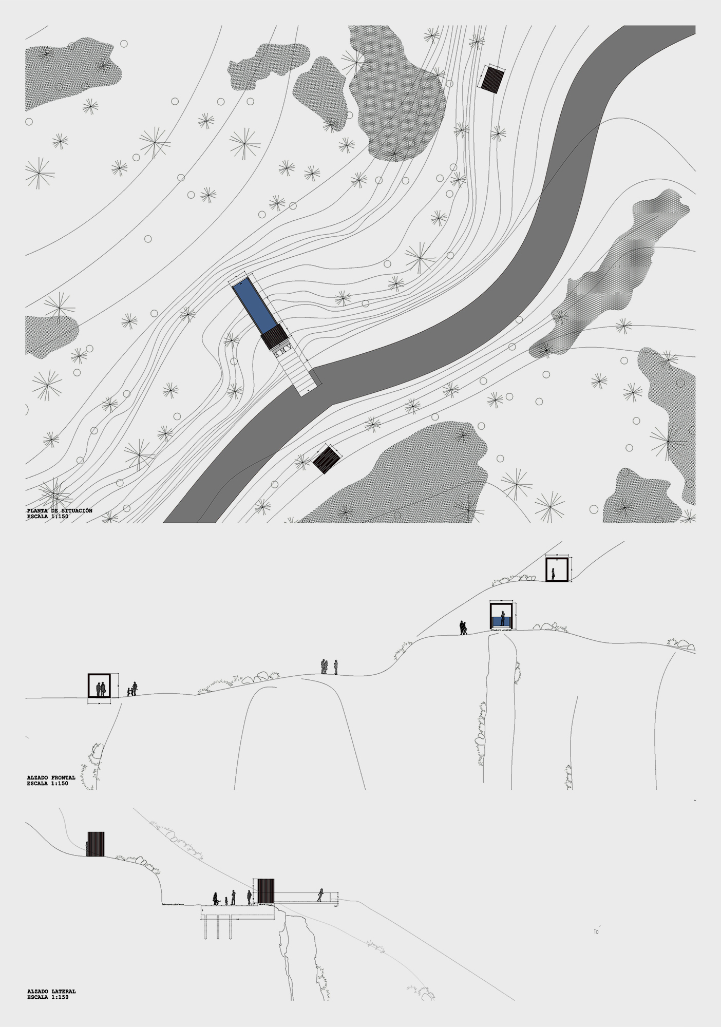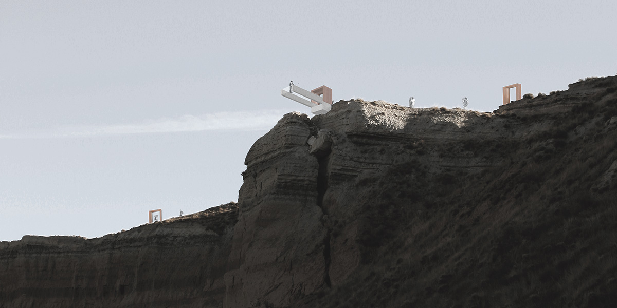 El proyecto propone, como primera premisa, una intervención de mínima transformación del territorio, que, por su condición reversible, no altere la fisonomía del lugar. En este sentido, el diseño que se presenta está dividido en 2 elementos claramente diferenciados: las puertas al horizonte y el podio elevado desde los que nos podemos asomar al vacío. Desde el máximo respeto a lo existente el objetivo es doble. Por un lado señalar, a modo de instalación de “land art”, la mirada hacia el horizonte definida por la presencia de unas puertas que construyen una nueva interpretación del paisaje. Y Por otro, elevarse para flotar.