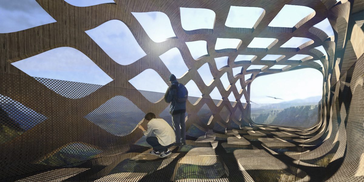 El proyecto propone, como primera premisa, una intervención de mínima transformación del territorio, que, por su condición reversible. Lo primero que nos acoge al llegar es un rótulo, a modo de icono de acogida, como si de una creación de land-art se tratara. Partiendo de él, se accede al mirador subiendo una pequeña rampa mueble. El mirador se extiende como un austero, a la vez que acogedor, refugio de montaña. Un ámbito para el descanso, la contemplación y el disfrute. La contemplación se puede realizar tanto desde el interior. Así los senderistas podrán volar desde la terraza que pretende extenderse hasta el último infinito.