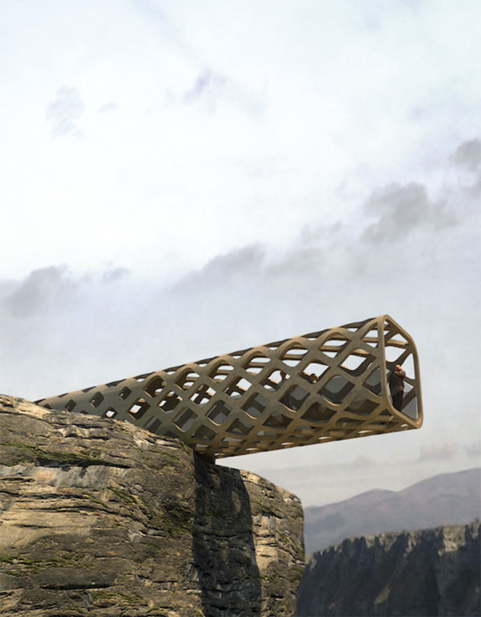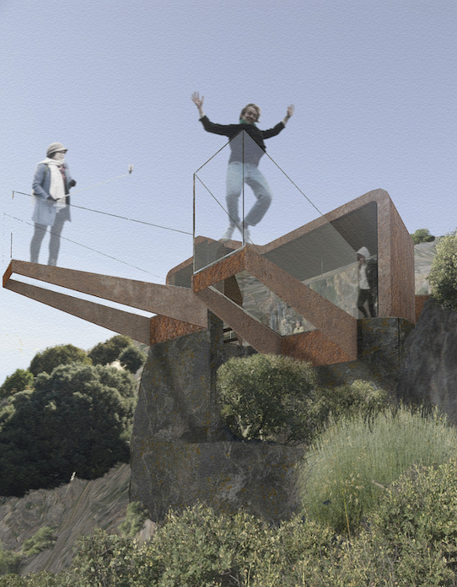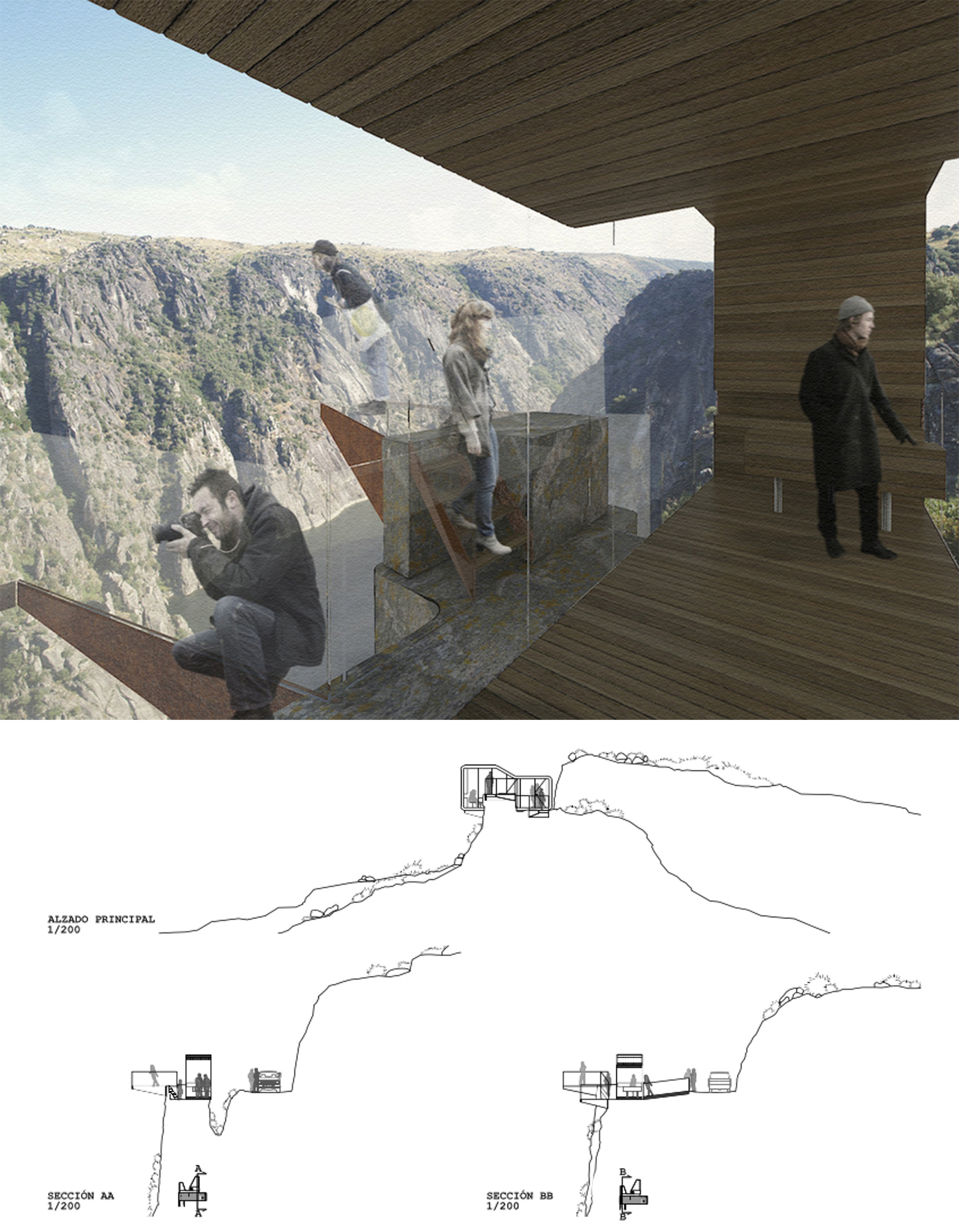 El proyecto propone, como primera premisa, una intervenciónn de mínima transformación del territorio, que, por su condición reversible, no altere la fisonomía del lugar. En este sentido, el diseño que se presenta está dividido en 4 elementos principales. Un pequeño aparcamiento, la rampa de acceso, la pequeña estancia de control, y los vuelos, desde los que nos podemos asomar al vacío. Desde el máximo respeto a lo existente, y a su historia, el objetivo es mantener “la silla del fraile” como elemento central del nuevo mirador. Así, asomarse al vacío es volar entre los elementos estructurales que, en referencia a Chillida “peinan el aire”.