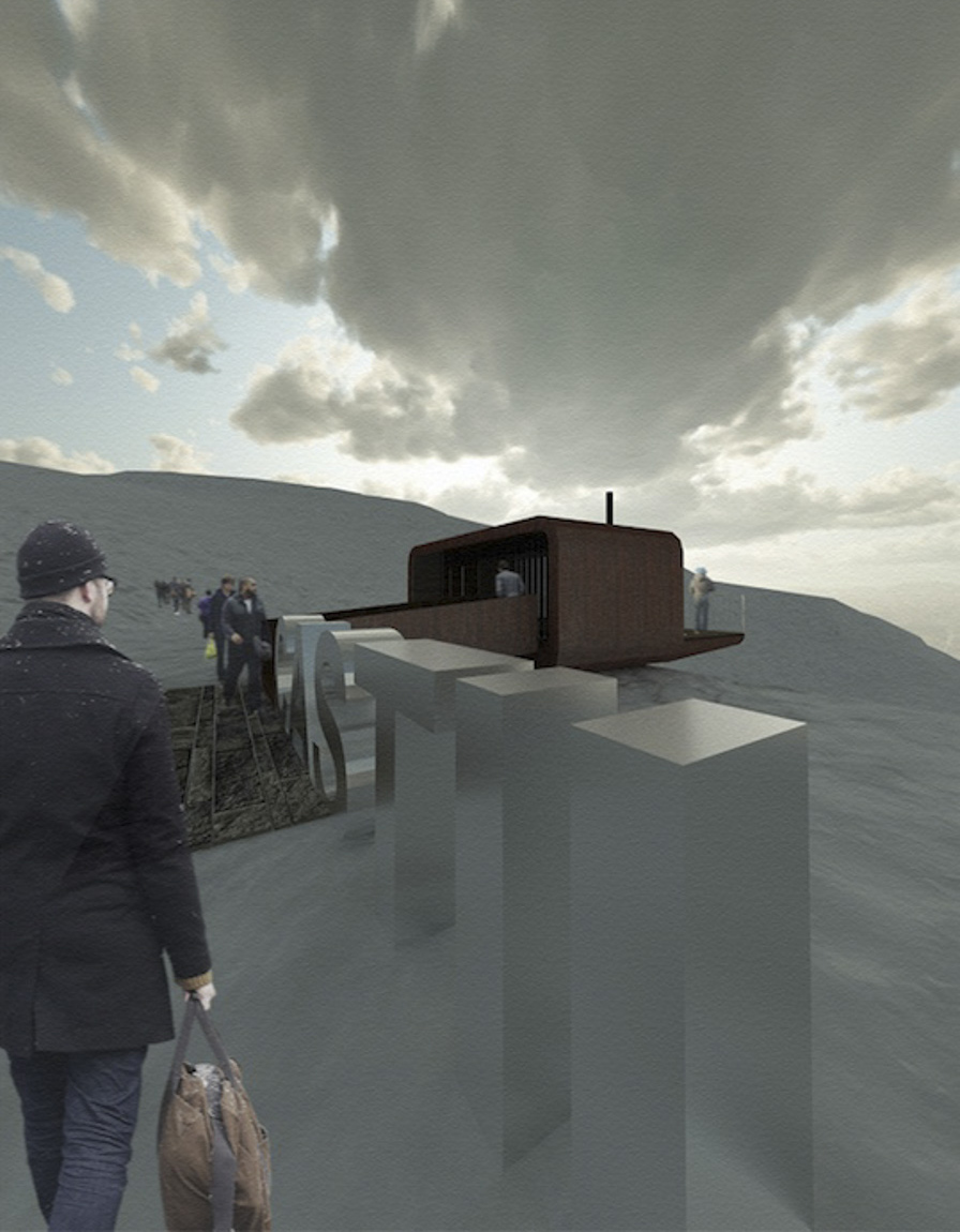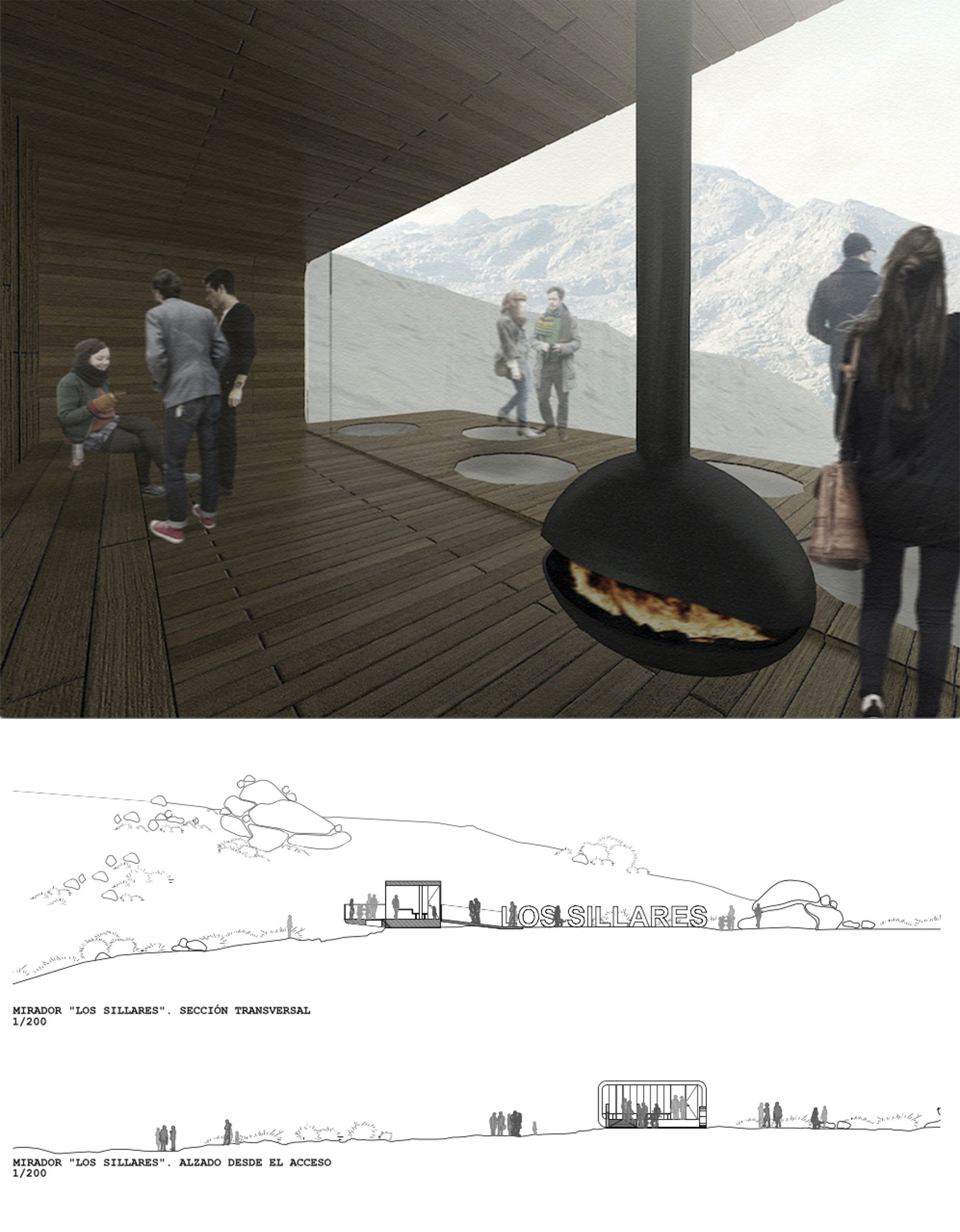 El proyecto propone, como primera premisa, una intervención de mínima transformación del territorio, que, por su condición reversible. Lo primero que nos acoge al llegar es un rótulo, a modo de icono de acogida, como si de una creación de land-art se tratara. Partiendo de él, se accede al mirador subiendo una pequeña rampa mueble. El mirador se extiende como un austero, a la vez que acogedor, refugio de montaña. Un ámbito para el descanso, la contemplación y el disfrute. La contemplación se puede realizar tanto desde el interior. Así los senderistas podrán volar desde la terraza que pretende extenderse hasta el último infinito.