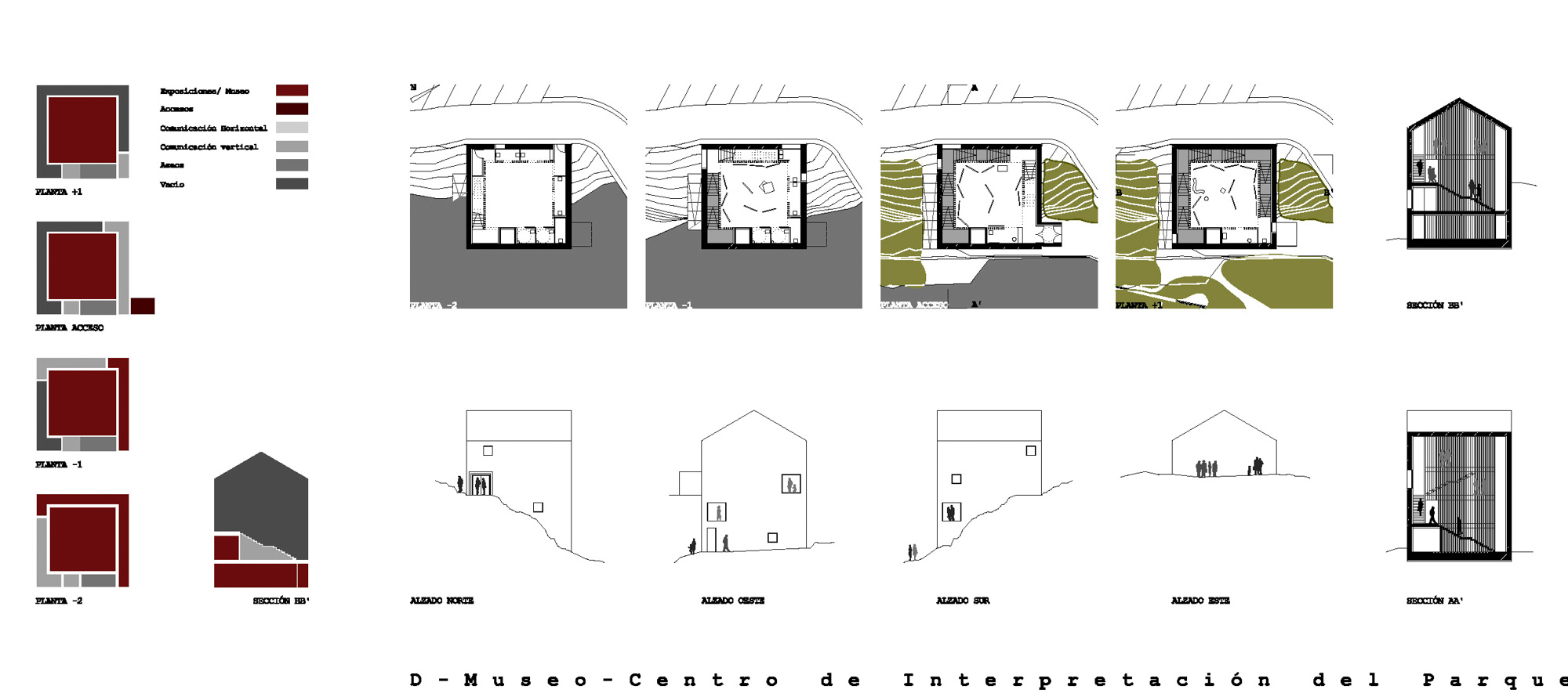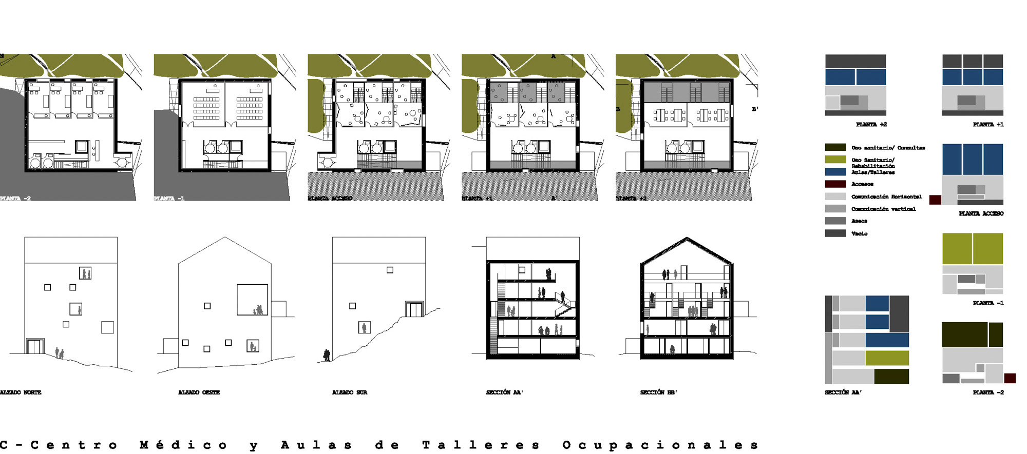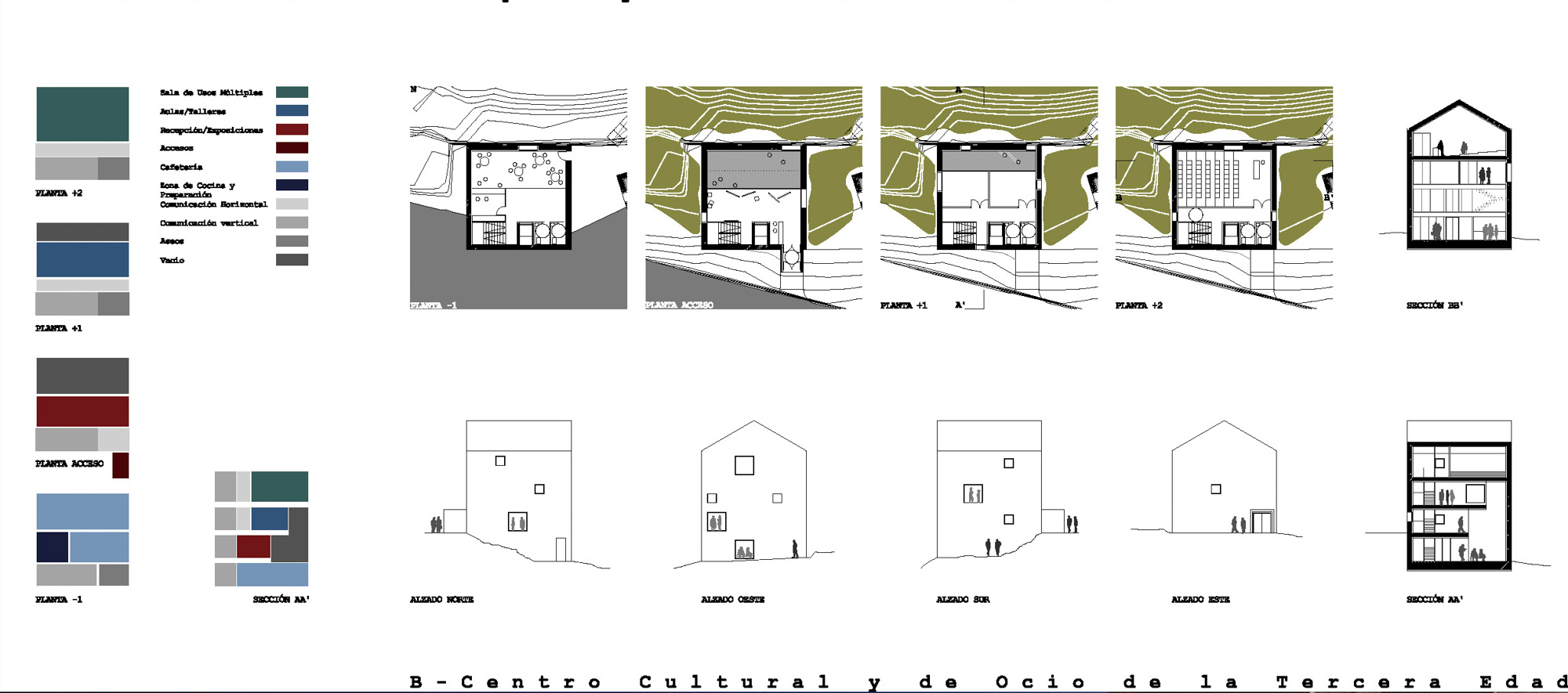 El resultado es la construcción de 4 edificios exentos que se basan en la reutilización del arquetipo de la casa, como representación esencial del habitar, y que albergan cada uno un uso diferenciado, pero bajo una apariencia semejante: Centro Médico y Aulas-Taller Ocupacionales, Centro Cultural y de Ocio de la 3ª Edad, Salón de Usos Múltiples y Biblioteca-Hemeroteca, Museo-Centro de Interpretación del Parque Natural de la Sierra de Huétor.