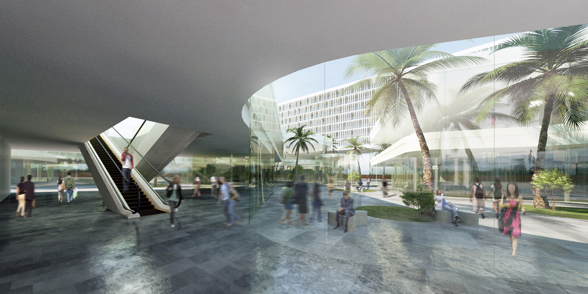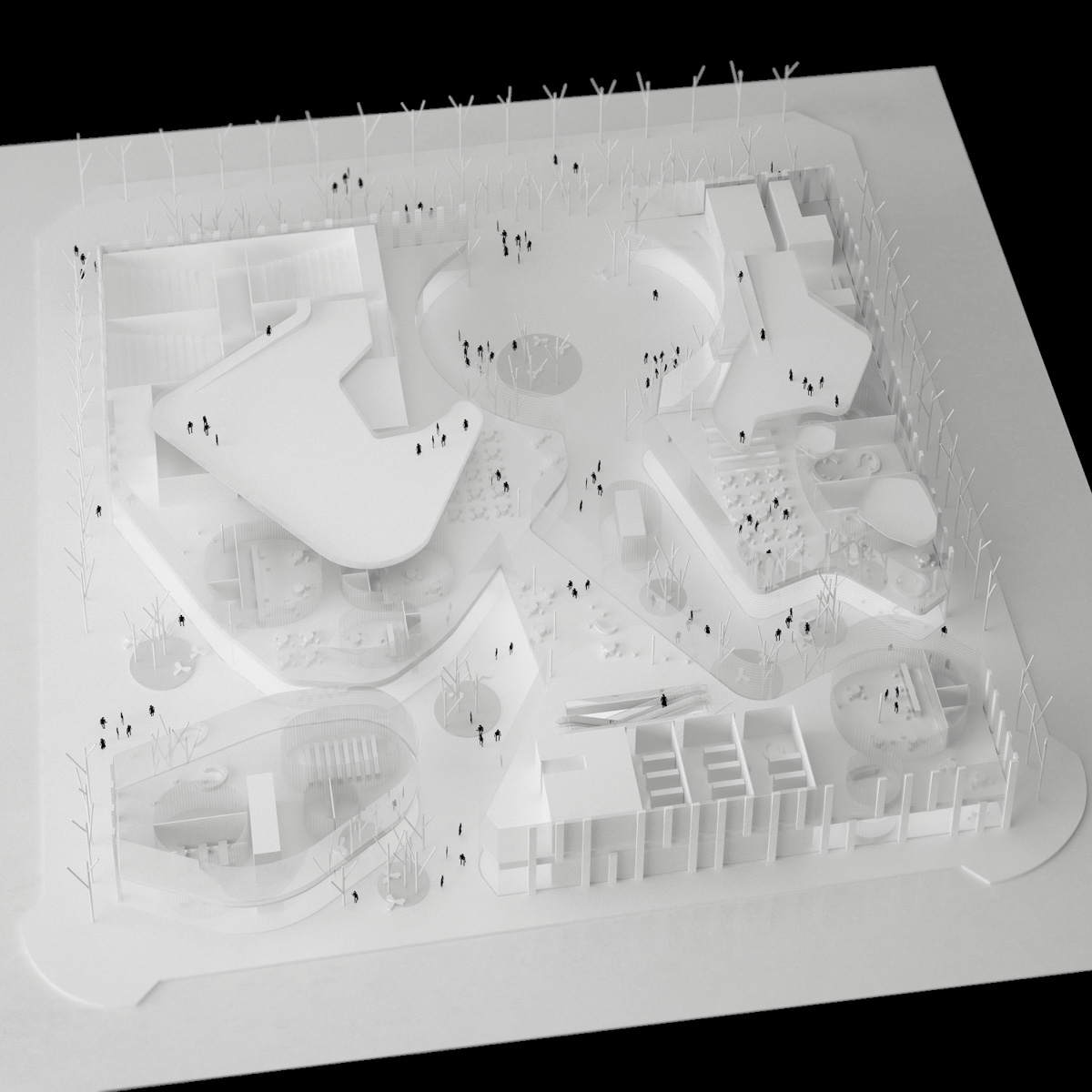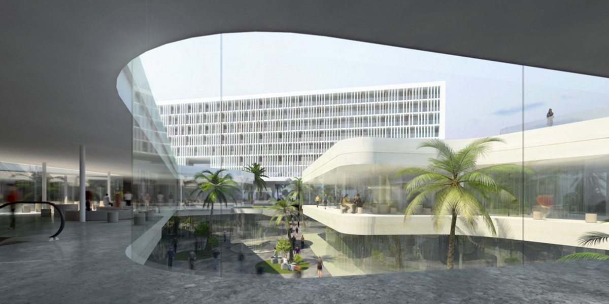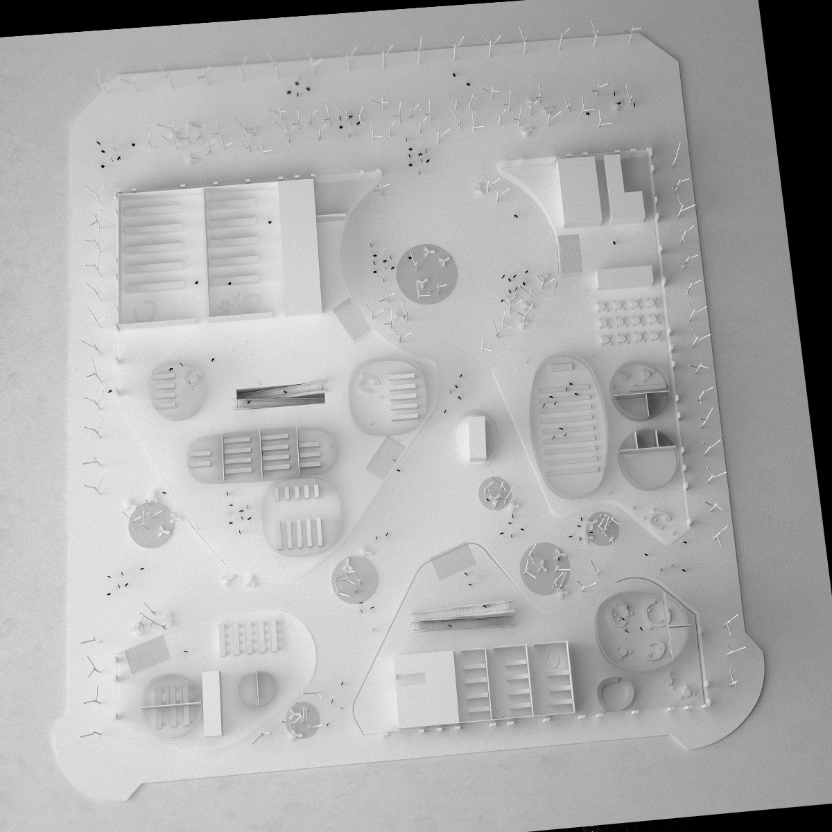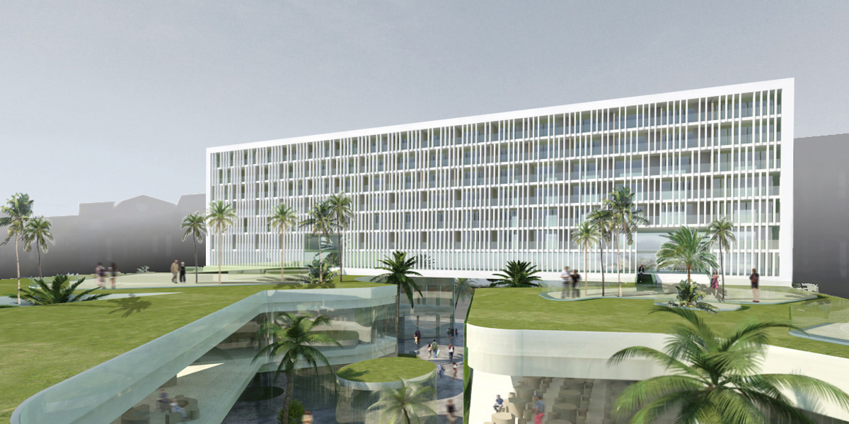 La propuesta de lo construido, se materializa en una planta cuadrada de 80 m. por 80 m, a modo de gran zócalo o edificio placa horizontal, de tan solo planta baja y primera. Sobre ese zócalo se procede a crear un proceso de permeabilización de la manzana, tratada como un todo, donde horadar sustrayendo: “El vacío para nosotros es tan importante como lo construido”. De este modo, desde todas las vías perimetrales, se accederá de manera natural, y a través de amplios espacios verdes peatonales, al interior público de la manzana.