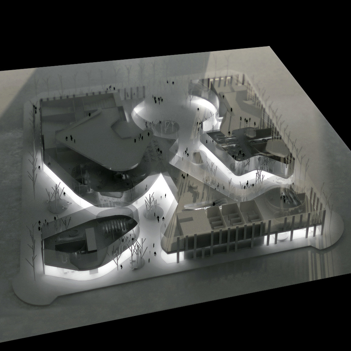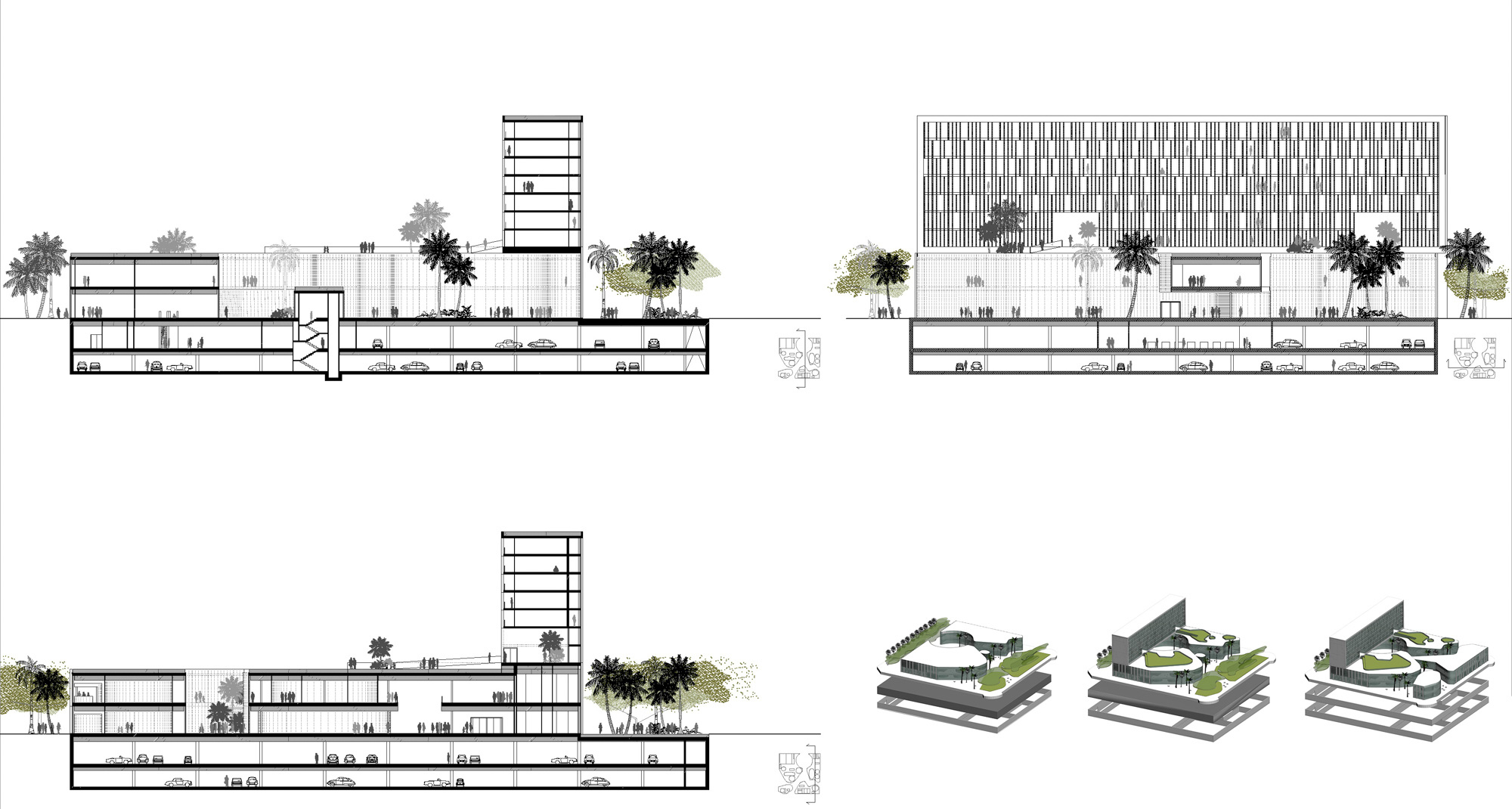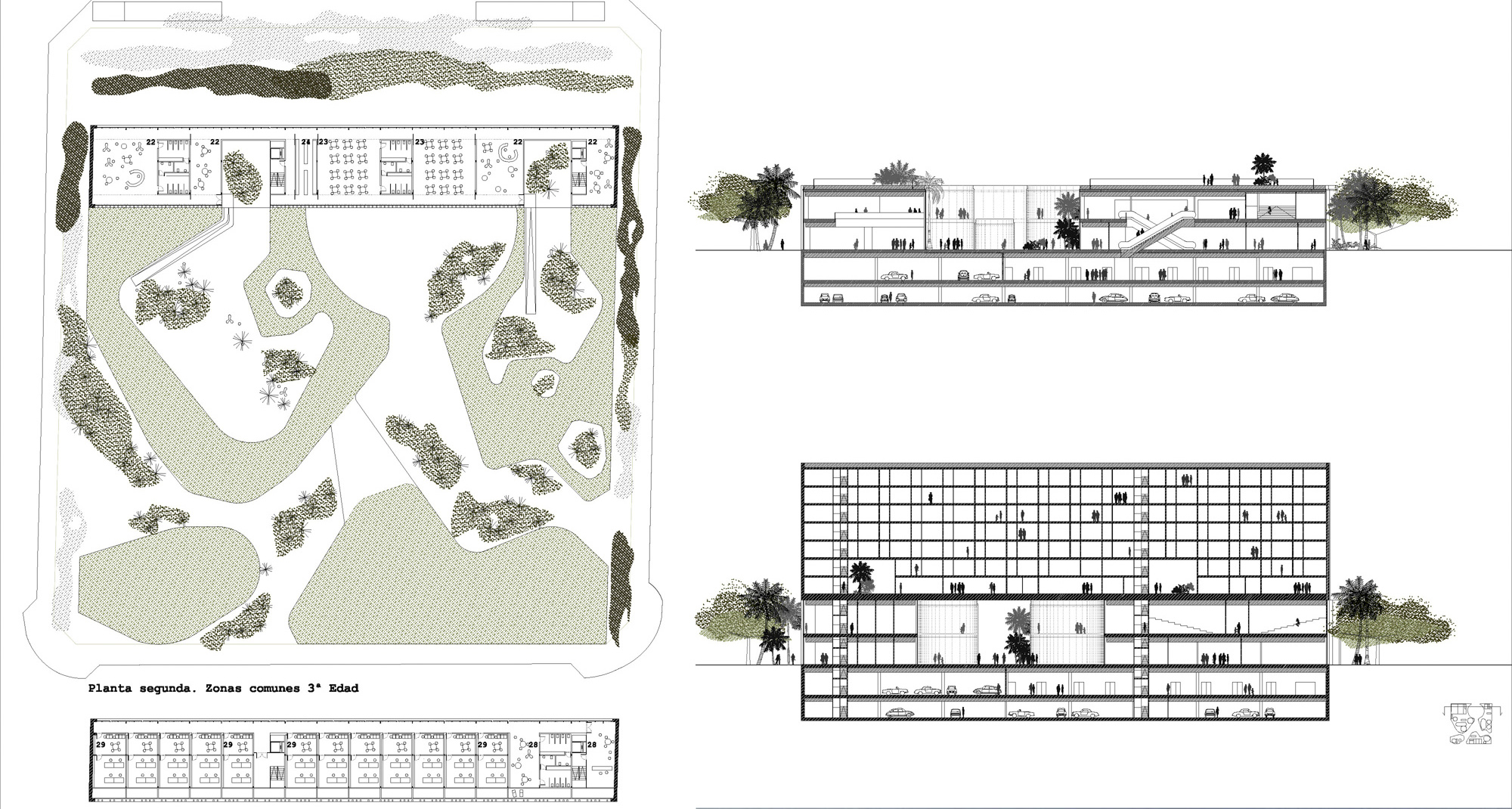 El solar del concurso se corresponde exactamente con una manzana aislada completa del ensanche de la ciudad de Gandía. Su posición, de cierto privilegio, se sitúa equidistante entre el Parc de L´Alquería Nova, al norte y el Parc del País Valenciá al sur. Nuestra propuesta pretende incorporar a la ciudad la percepción de la existencia de una nueva superficie verde, como área de relación entre ambos parque existentes, coexistiendo con la necesidad de construir un gran complejo dotacional socio-sanitario, comercial de ocio y residencal. Así, construiremos para articular todo ello un completo parque verde en las alturas.