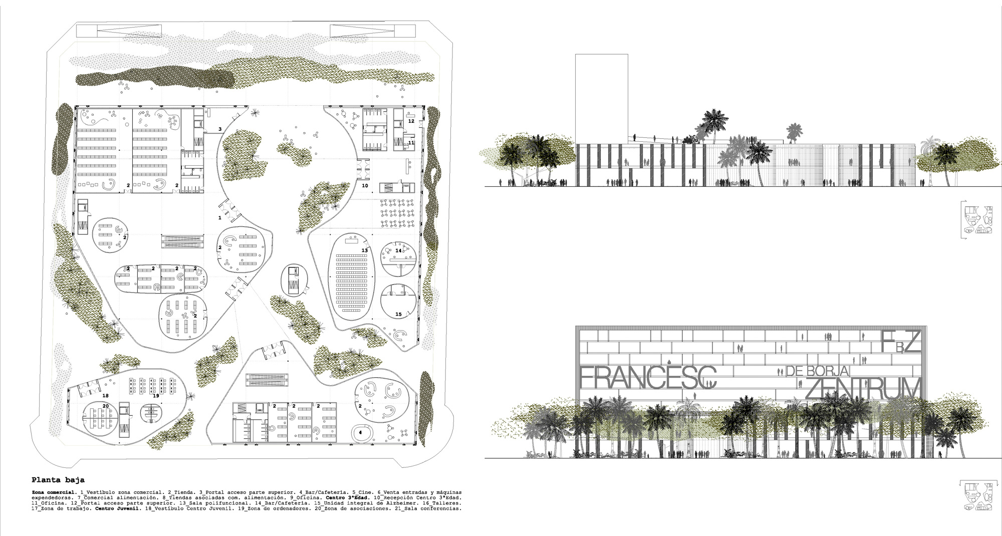 Sobre rasante se busca un edificio adecuado, pero singular, necesario para la transmisión de una imagen de marca como la que genera el concepto FBZ “Francesc de Borja Zentrum”. Así, el edificio que desarrolla en la Planta Baja y Planta Primera, está compuesto de tres partes claramente diferenciadas: Centro asistencial de la 3ª Edad, que incluye un área de atención asistencial de asistidos y enfermos de Alzehimer, Centro Lúdico-Comercial, que incluye áreas de restauración y, finalmente, Espacio Joven.