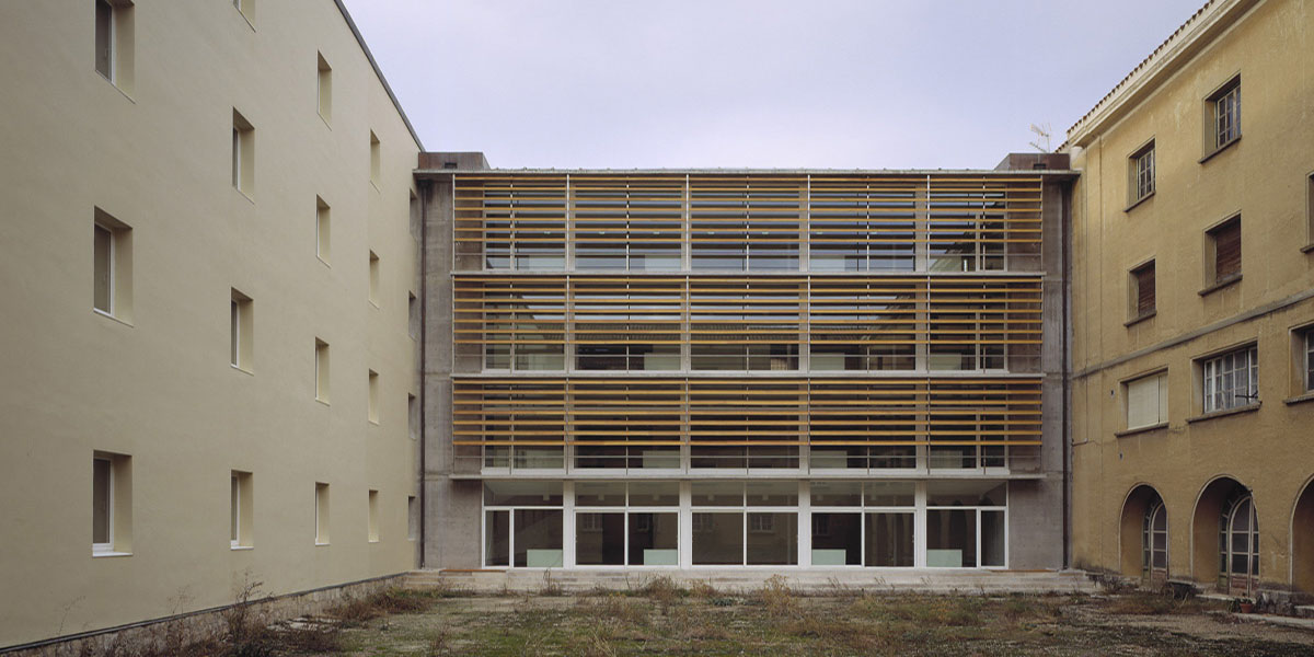 La residencia, al estar desarrollada en una geometría tan definida alrededor del patio y conformada en forma de «u», permite la dedicación de dos alas al programa de habitación y la tercera, de mayor crujía, al contenedor del teatro y la sala de usos múltiples.