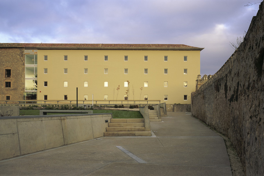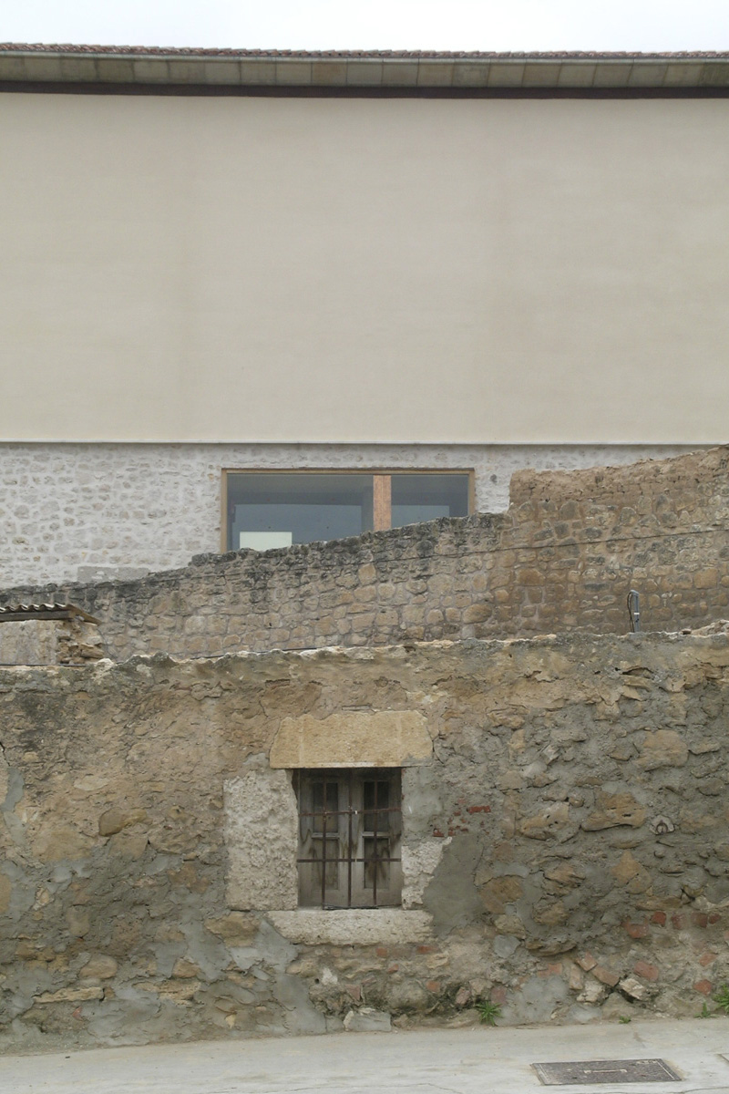 El acceso creado en la residencia desde el jardín intramuros, vincula su vestíbulo al entendimiento de la totalidad de la crujía de la galería, entendida como nueva intervención y con un claro carácter autónomo, es por ello por lo que se hace presente en la fachada al jardín como pieza delimitadora y a la vez coordinadora de la fachada del palacio y la ampliación de la residencia.