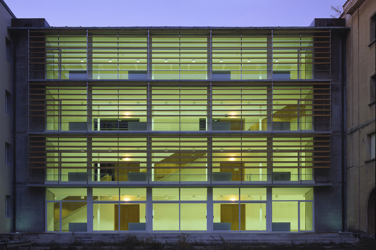 La residencia, al estar desarrollada en una geometría tan definida alrededor del patio y conformada en forma de «u», permite la dedicación de dos alas al programa de habitación y la tercera, de mayor crujía, al contenedor del teatro y la sala de usos múltiples.