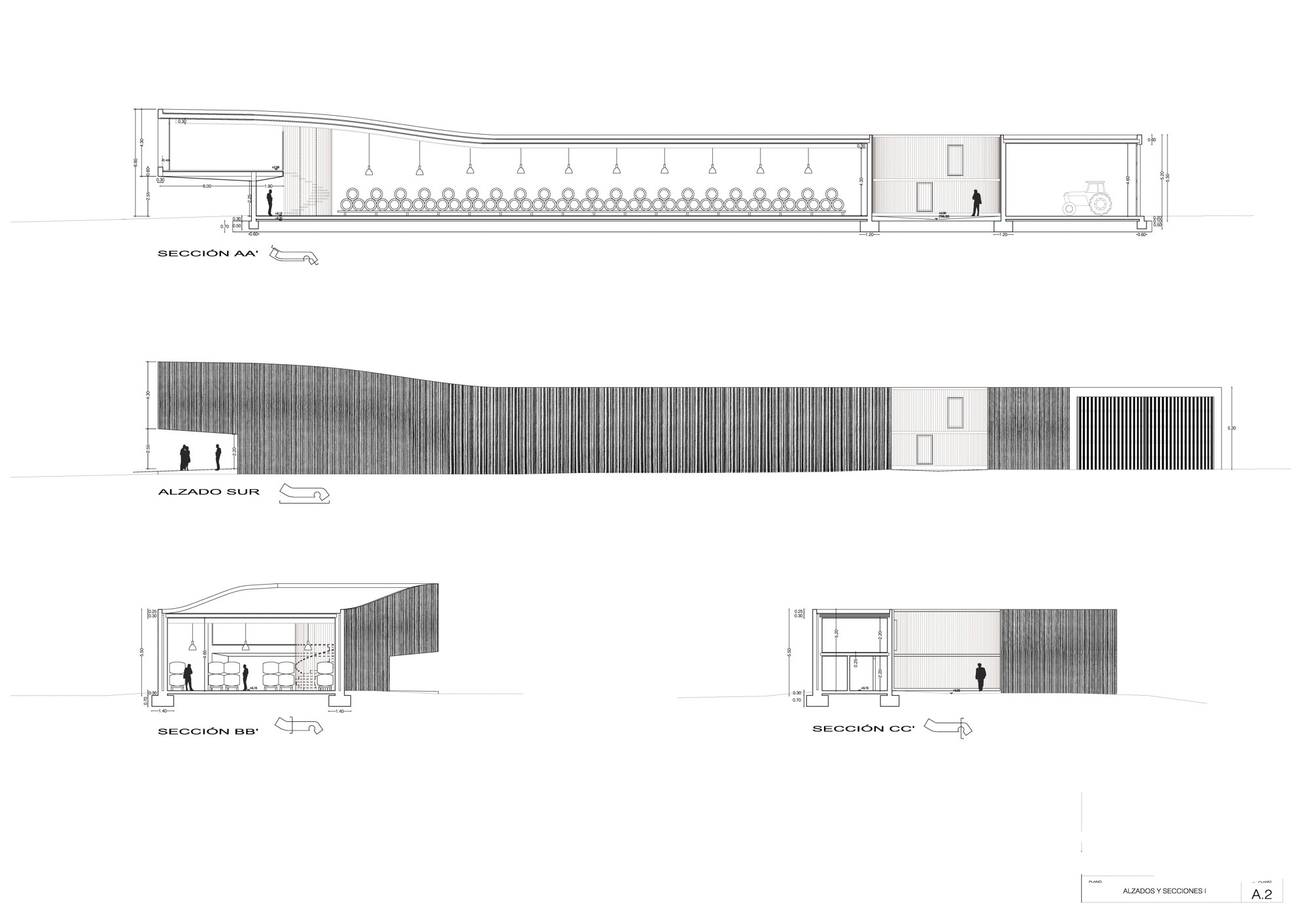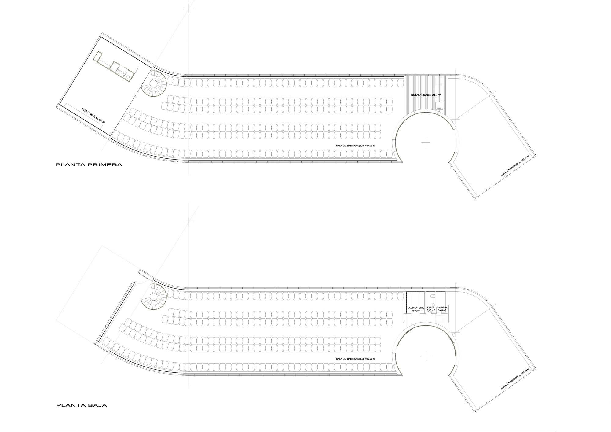 Se organiza el edificio como una nave longitudinal con espacio de almacenamiento de barricas en disposición Este-Oeste. La orientación del edificio permite su funcionamiento más adecuado respecto del existente, mediante una separación que se ocupa por una plataforma de aparcamiento. El edificio proyectado se sitúa paralelamente al camino de servicio con acceso directo al almacén agrícola. A continuación se organiza un patio de barricas que da acceso a la nave principal y a un área de trabajo formado por un laboratorio, sala de calderas y aseos.