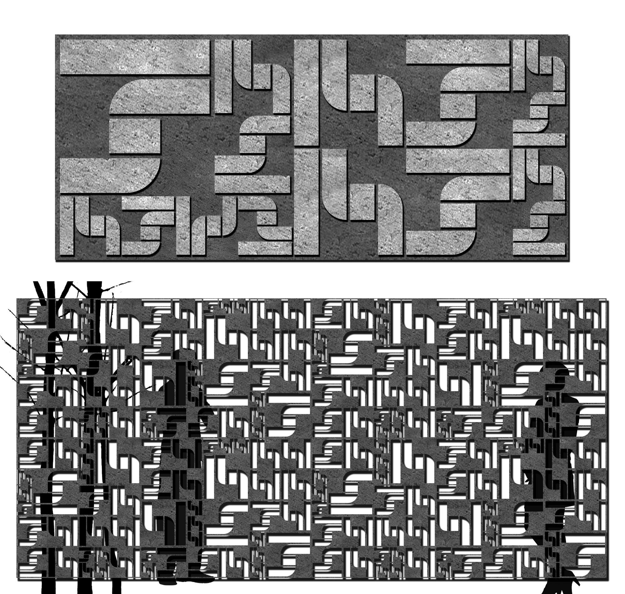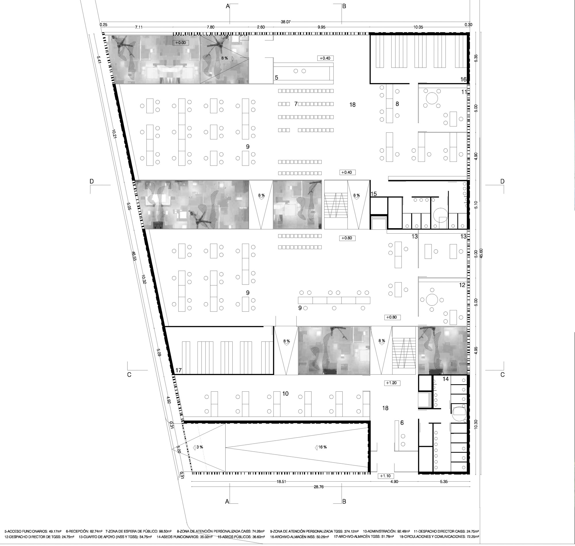 Dado que el edificio no puede ser representativo por sus dimensiones en superficie o en altura, se propone un tratamiento elaborado de las superficies de fachada mediante la sucesión de paños de hormigón prefabricado de dos tipos, unos opacos u otros calados a modo de reja, que se adaptan a las condiciones de los espacios que se distribuyen en el perímetro del edificio recordando las celosías de inspiración árabe. Para su diseño definitivo se utilizan los anagramas conocidos tanto del Instituto Nacional de la Seguridad Social como de la Tesorería General de la Seguridad Social.
