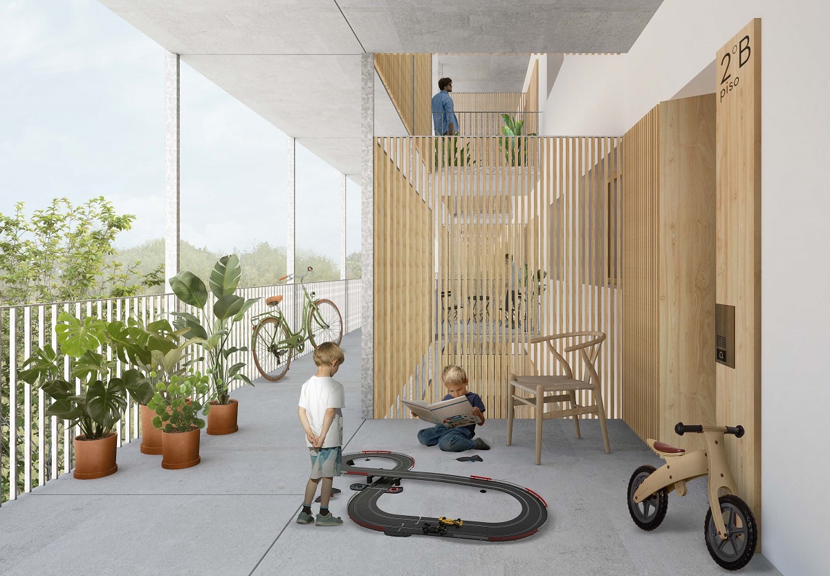 Otro aspecto importante e que se ha tenido en cuenta en el diseño es su versatilidad, permitiendo por ello un uso muy abierto de los espacios. Con ello se consiguen programas de ocupación de pareja con hijo/os, pareja y espacio de trabajo, compañeros y espacio de trabajo…la versatilidad, apoyada en la adaptabilidad son un pilar fundamental de la sostenibilidad en el tiempo.