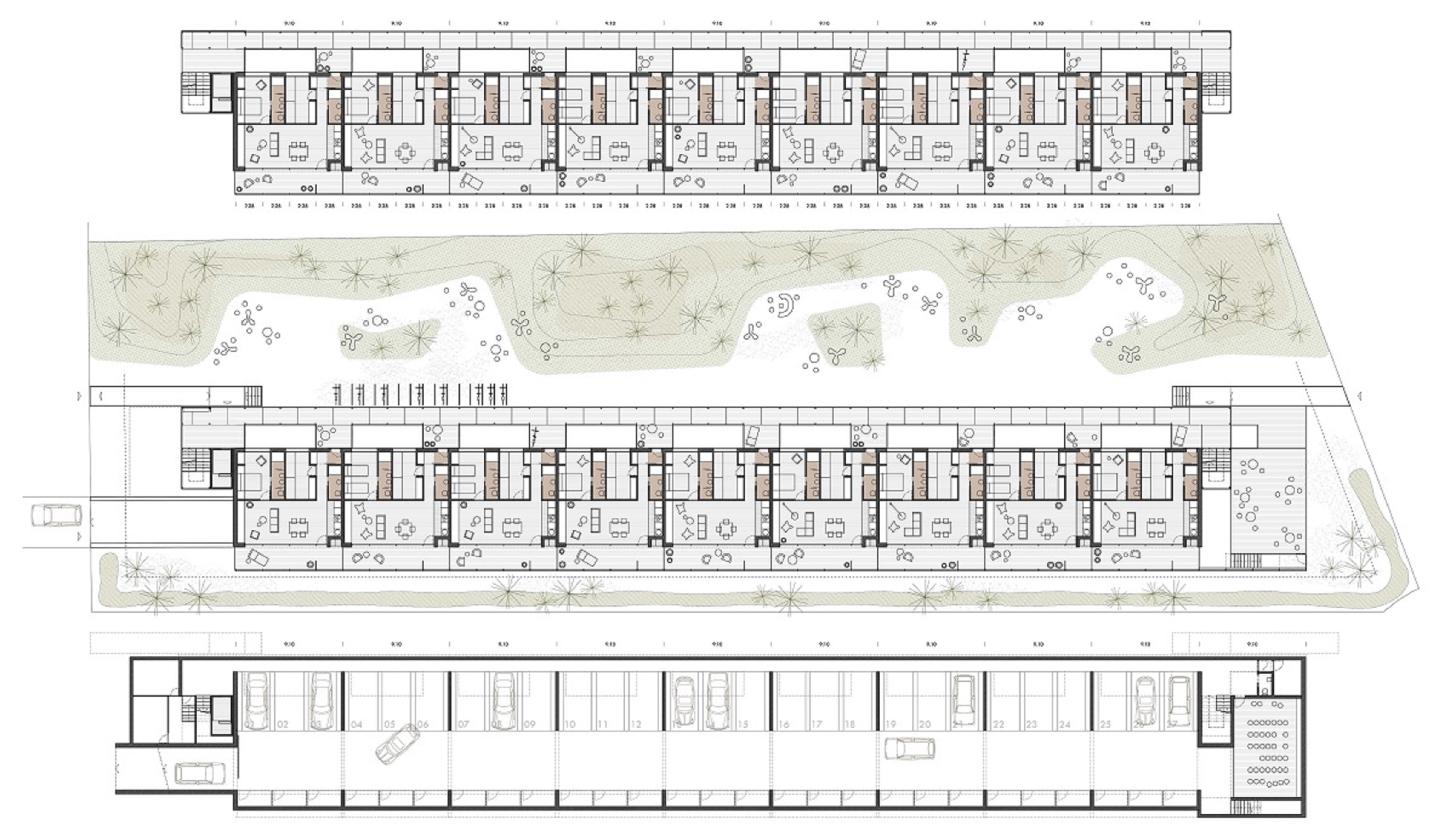Se plantea un bloque de orientación norte-sur a fin de aprovechar de manera eficiente el soleamiento y las corrientes de aire naturales, obteniendo calefactación natural en invierno y refrigeración en verano. Se aprovecha también la topografía del solar, que presenta una zona deprimida de casi un metro en su interior, lo que permite crear un semisótano para el aparcamiento sin apenas coste.